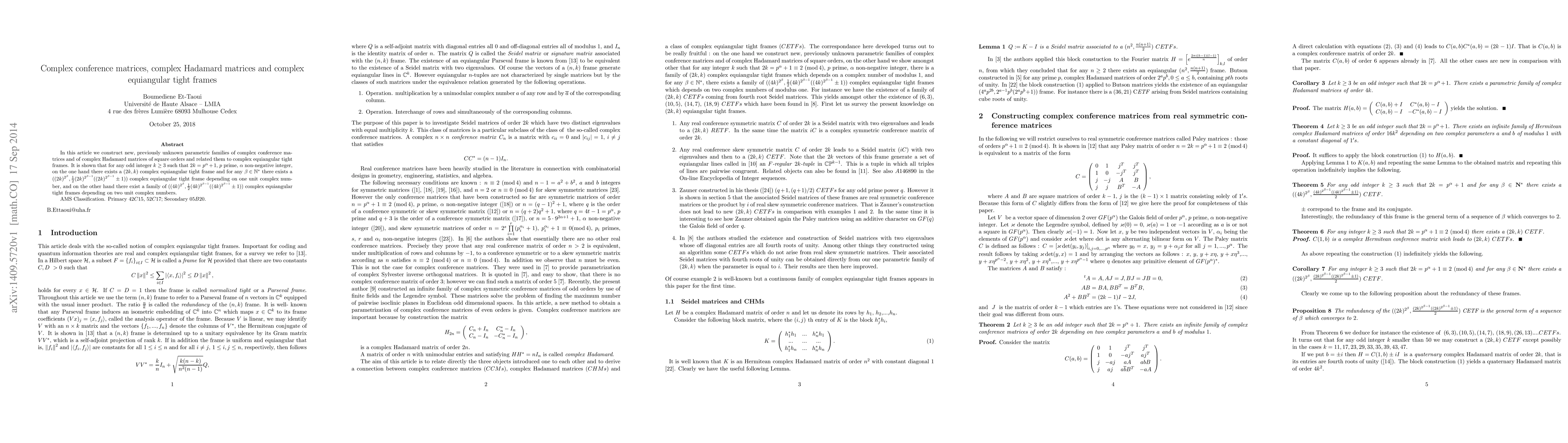 Summary: The paper introduces new parametric families of complex conference matrices and complex Hadamard matrices of square orders, establishing their connections to complex equiangular tight frames. These findings expand the understanding of these mathematical structures.