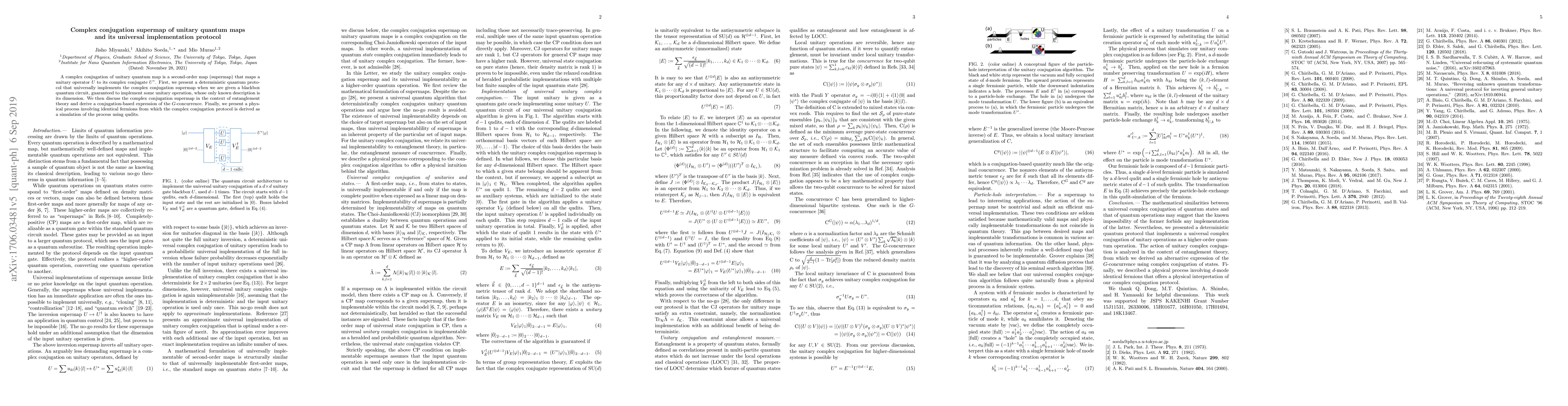 This paper presents a quantum protocol for universally implementing the complex conjugation supermap on any unitary quantum map given only its dimension. It also explores the implications of this supermap in entanglement theory and derives a conjugation-based expression for the $G$-concurrence, ultimately linking it to a physical process involving identical fermions.