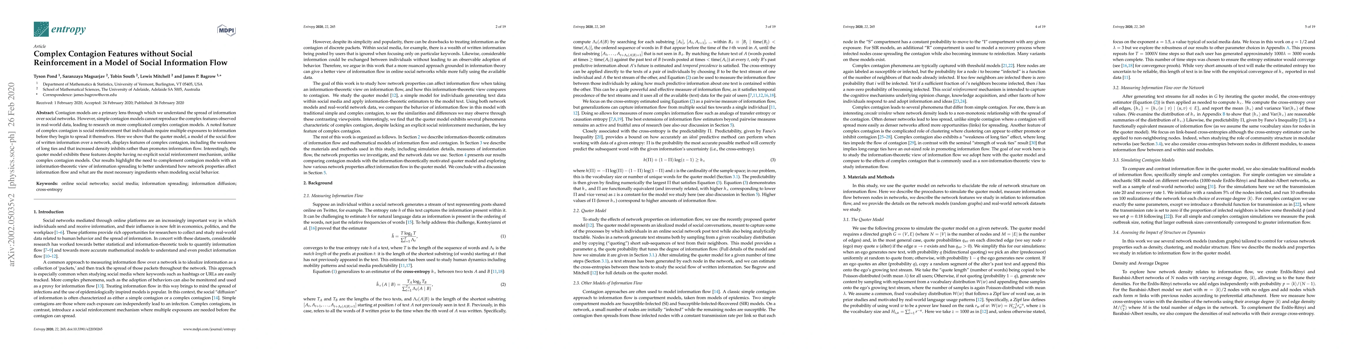Contagion models are a primary lens through which we understand the spread of information over social networks. However, simple contagion models cannot reproduce the complex features observed in real-world data, leading to research on more complicated complex contagion models. A noted feature of complex contagion is social reinforcement that individuals require multiple exposures to information before they begin to spread it themselves. Here we show that the quoter model, a model of the social flow of written information over a network, displays features of complex contagion, including the weakness of long ties and that increased density inhibits rather than promotes information flow. Interestingly, the quoter model exhibits these features despite having no explicit social reinforcement mechanism, unlike complex contagion models. Our results highlight the need to complement contagion models with an information-theoretic view of information spreading to better understand how network properties affect information flow and what are the most necessary ingredients when modeling social behavior.