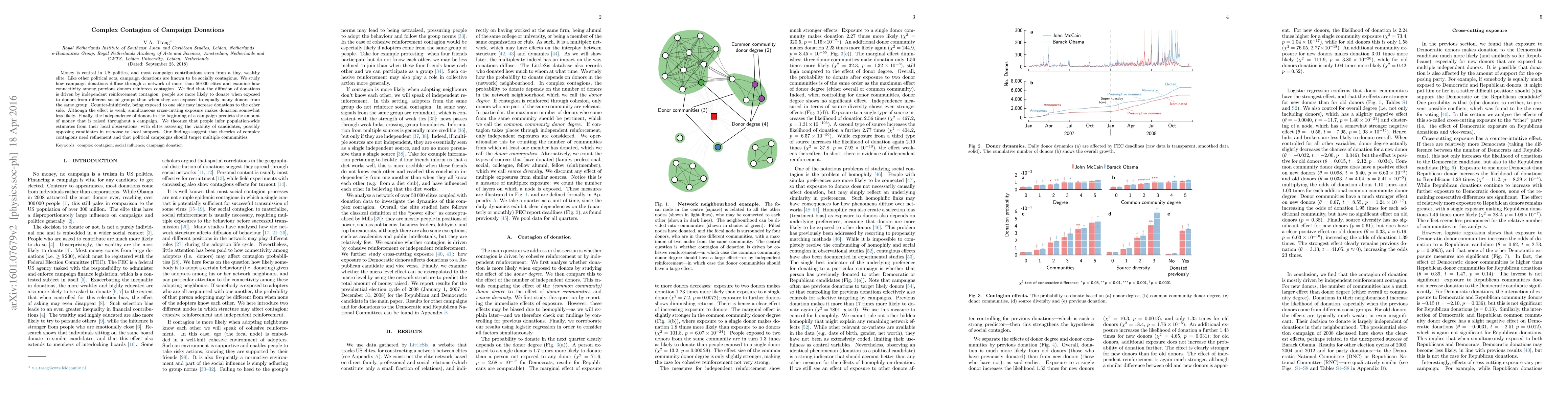 Money is central in US politics, and most campaign contributions stem from a tiny, wealthy elite. Like other political acts, campaign donations are known to be socially contagious. We study how campaign donations diffuse through a network of more than 50 000 elites and examine how connectivity among previous donors reinforces contagion. We find that the diffusion of donations is driven by independent reinforcement contagion: people are more likely to donate when exposed to donors from different social groups than when they are exposed to equally many donors from the same group. Counter-intuitively, being exposed to one side may increase donations to the other side. Although the effect is weak, simultaneous cross-cutting exposure makes donation somewhat less likely. Finally, the independence of donors in the beginning of a campaign predicts the amount of money that is raised throughout a campaign. We theorize that people infer population-wide estimates from their local observations, with elites assessing the viability of candidates, possibly opposing candidates in response to local support. Our findings suggest that theories of complex contagions need refinement and that political campaigns should target multiple communities.