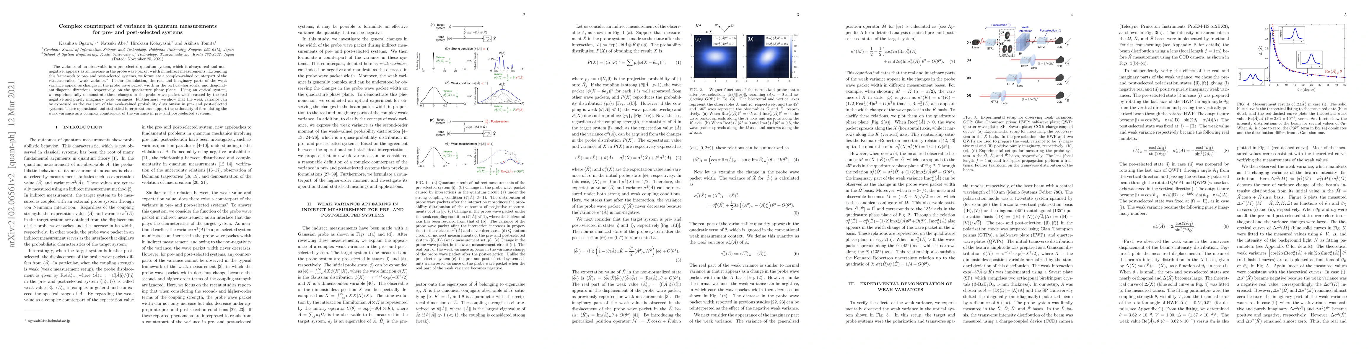 The variance of an observable in a pre-selected quantum system, which is always real and non-negative, appears as an increase in the probe wave packet width in indirect measurements. Extending this framework to pre- and post-selected systems, we formulate a complex-valued counterpart of the variance called "weak variance." In our formulation, the real and imaginary parts of the weak variance appear as changes in the probe wave packet width in the vertical-horizontal and diagonal-antidiagonal directions, respectively, on the quadrature phase plane. Using an optical system, we experimentally demonstrate these changes in the probe wave packet width caused by the real negative and purely imaginary weak variances. Furthermore, we show that the weak variance can be expressed as the variance of the weak-valued probability distribution in pre- and post-selected systems. These operational and statistical interpretations support the rationality of formulating the weak variance as a complex counterpart of the variance in pre- and post-selected systems.