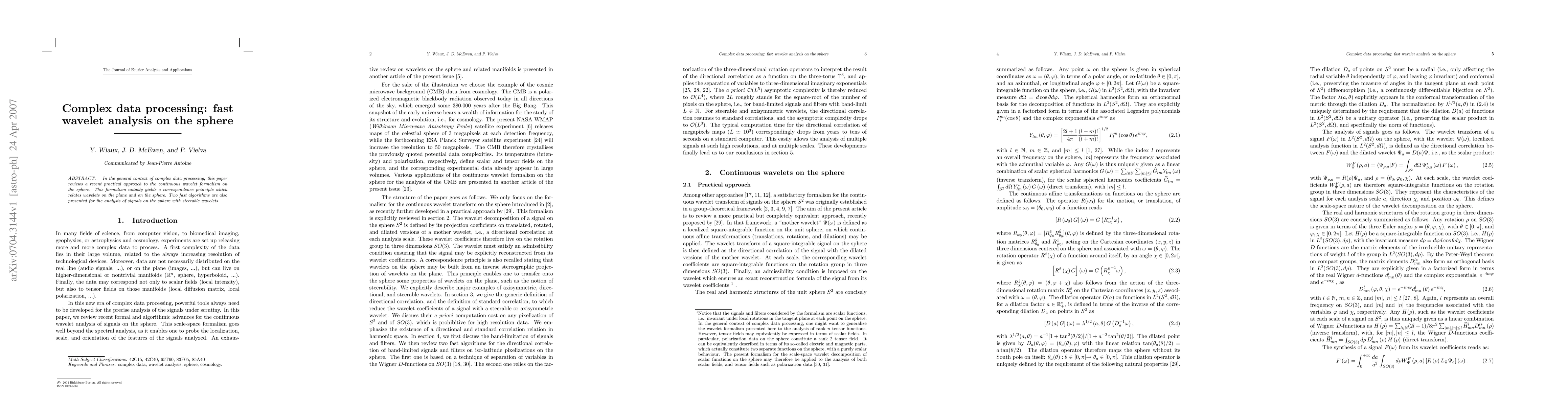 In the general context of complex data processing, this paper reviews a recent practical approach to the continuous wavelet formalism on the sphere. This formalism notably yields a correspondence principle which relates wavelets on the plane and on the sphere. Two fast algorithms are also presented for the analysis of signals on the sphere with steerable wavelets.
