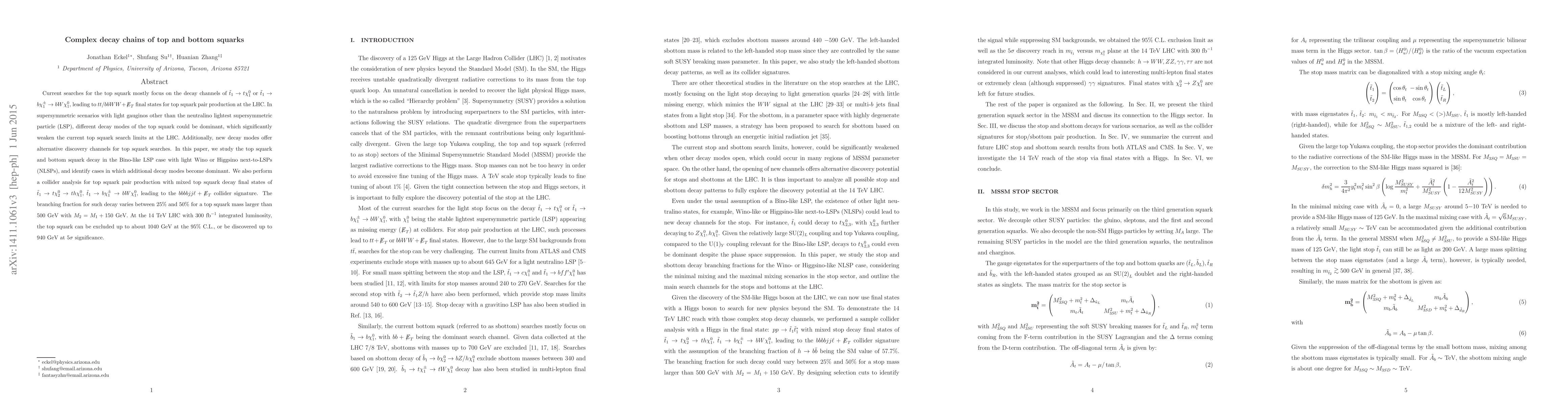 Current searches for the top squark mostly focus on the decay channels of $\tilde{t}_1 \rightarrow t \chi_1^0$ or $\tilde{t}_1 \rightarrow b \chi_1^\pm \rightarrow bW \chi_1^0$, leading to $tt/bbWW+\not\mathrel{E}_T$ final states for top squark pair production at the LHC. In supersymmetric scenarios with light gauginos other than the neutralino lightest supersymmetric particle (LSP), different decay modes of the top squark could be dominant, which significantly weaken the current top squark search limits at the LHC. Additionally, new decay modes offer alternative discovery channels for top squark searches. In this paper, we study the top squark and bottom squark decay in the Bino-like LSP case with light Wino or Higgsino next-to-LSPs (NLSPs), and identify cases in which additional decay modes become dominant. We also perform a collider analysis for top squark pair production with mixed top squark decay final states of $\tilde{t}_1 \to t {\chi}_2^0 \to th {\chi}_1^0$, $\tilde{t}_1 \to b {\chi}_1^\pm \to bW {\chi}_1^0 $, leading to the $bbbbjj\ell+\not\mathrel{E}_T$ collider signature. The branching fraction for such decay varies between 25\% and 50\% for a top squark mass larger than 500 GeV with $M_2=M_1+150$ GeV. At the 14 TeV LHC with 300 ${\rm fb}^{-1}$ integrated luminosity, the top squark can be excluded up to about 1040 GeV at the 95\% C.L., or be discovered up to 940 GeV at 5$\sigma$ significance.