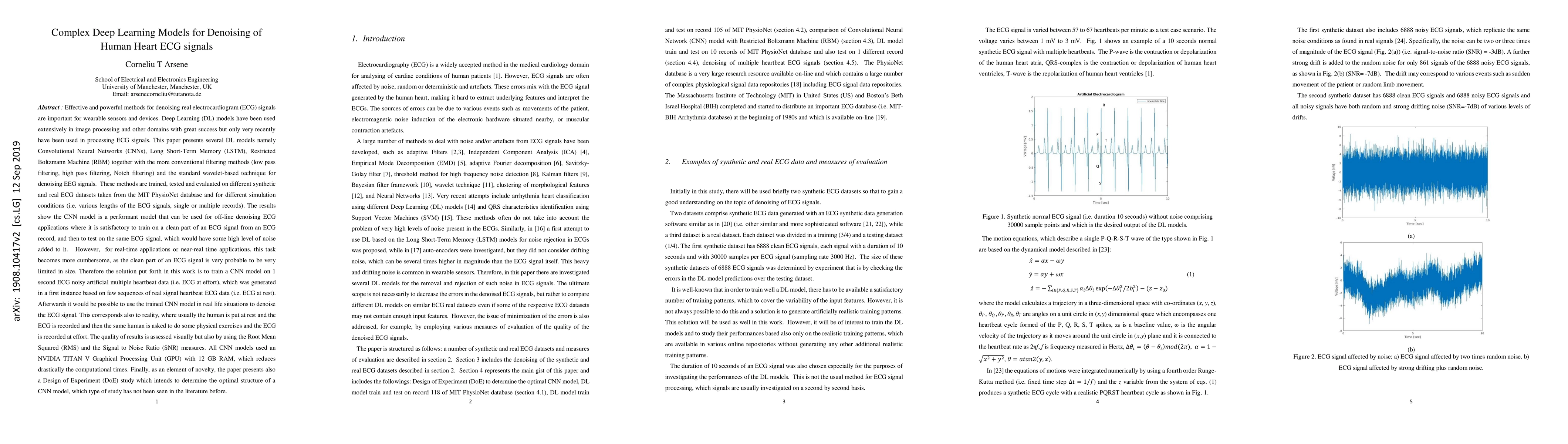Effective and powerful methods for denoising real electrocardiogram (ECG) signals are important for wearable sensors and devices. Deep Learning (DL) models have been used extensively in image processing and other domains with great success but only very recently have been used in processing ECG signals. This paper presents several DL models namely Convolutional Neural Networks (CNNs), Long Short-Term Memory (LSTM), Restricted Boltzmann Machine (RBM) together with the more conventional filtering methods (low pass filtering, high pass filtering, Notch filtering) and the standard wavelet-based technique for denoising EEG signals. These methods are trained, tested and evaluated on different synthetic and real ECG datasets taken from the MIT PhysioNet database and for different simulation conditions (i.e. various lengths of the ECG signals, single or multiple records). The results show the CNN model is a performant model that can be used for off-line denoising ECG applications where it is satisfactory to train on a clean part of an ECG signal from an ECG record, and then to test on the same ECG signal, which would have some high level of noise added to it. However, for real-time applications or near-real time applications, this task becomes more cumbersome, as the clean part of an ECG signal is very probable to be very limited in size. Therefore the solution put forth in this work is to train a CNN model on 1 second ECG noisy artificial multiple heartbeat data (i.e. ECG at effort), which was generated in a first instance based on few sequences of real signal heartbeat ECG data (i.e. ECG at rest). Afterwards it would be possible to use the trained CNN model in real life situations to denoise the ECG signal.