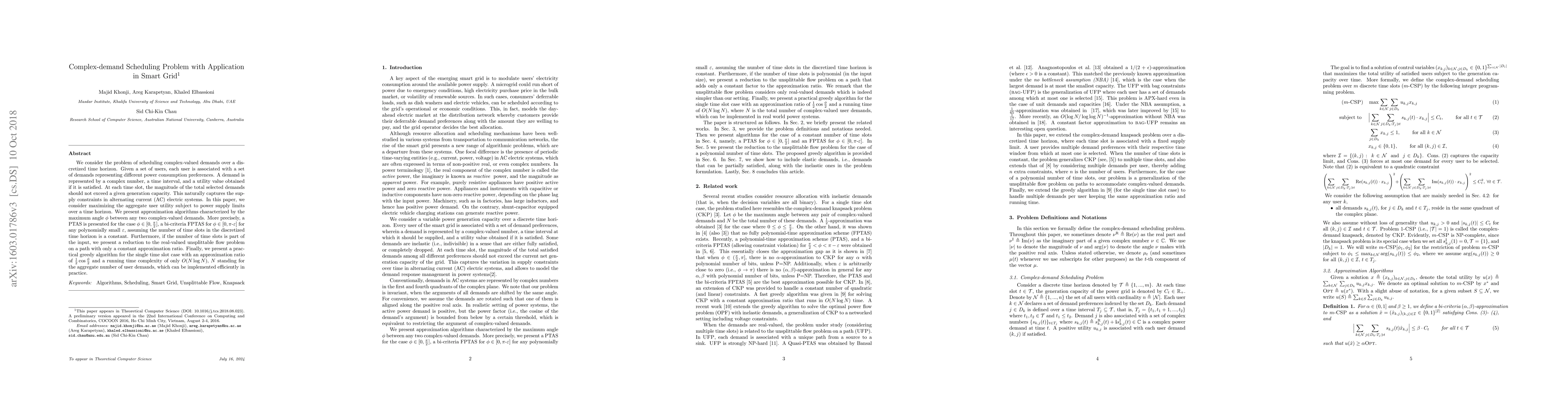 We consider the problem of scheduling complex-valued demands over a discretized time horizon. Given a set of users, each user is associated with a set of demands representing different power consumption preferences. A demand is represented by a complex number, a time interval, and a utility value obtained if it is satisfied. At each time slot, the magnitude of the total selected demands should not exceed a given generation capacity. This naturally captures the supply constraints in alternating current (AC) electric systems. In this paper, we consider maximizing the aggregate user utility subject to power supply limits over a time horizon. We present approximation algorithms characterized by the maximum angle $\phi$ between any two complex-valued demands. More precisely, a PTAS is presented for the case $\phi \in [0,\tfrac{\pi}{2}]$, a bi-criteria FPTAS for $\phi \in [0,{\pi} \mbox{-} \varepsilon]$ for any polynomially small $\varepsilon$, assuming the number of time slots in the discretized time horizon is a constant. Furthermore, if the number of time slots is part of the input, we present a reduction to the real-valued unsplittable flow problem on a path with only a constant approximation ratio. Finally, we present a practical greedy algorithm for the single time slot case with an approximation ratio of $\tfrac{1}{2}\cos \frac{\phi}{2}$ and a running time complexity of only ${O}(N\log N)$, $N$ standing for the aggregate number of user demands, which can be implemented efficiently in practice.