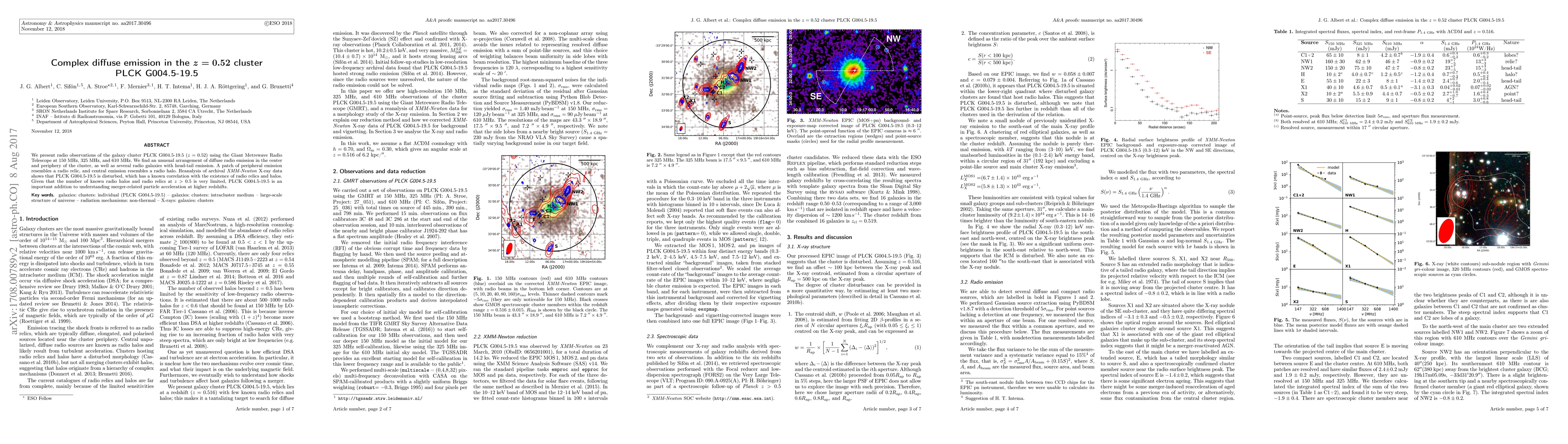 This study uses radio observations to identify unusual diffuse emission in the galaxy cluster PLCK G004.5-19.5, revealing both a radio relic and a radio halo, suggesting merger-related particle acceleration. The cluster's disturbed state, confirmed by XMM-Newton data, adds to the limited knowledge of such phenomena at high redshifts.