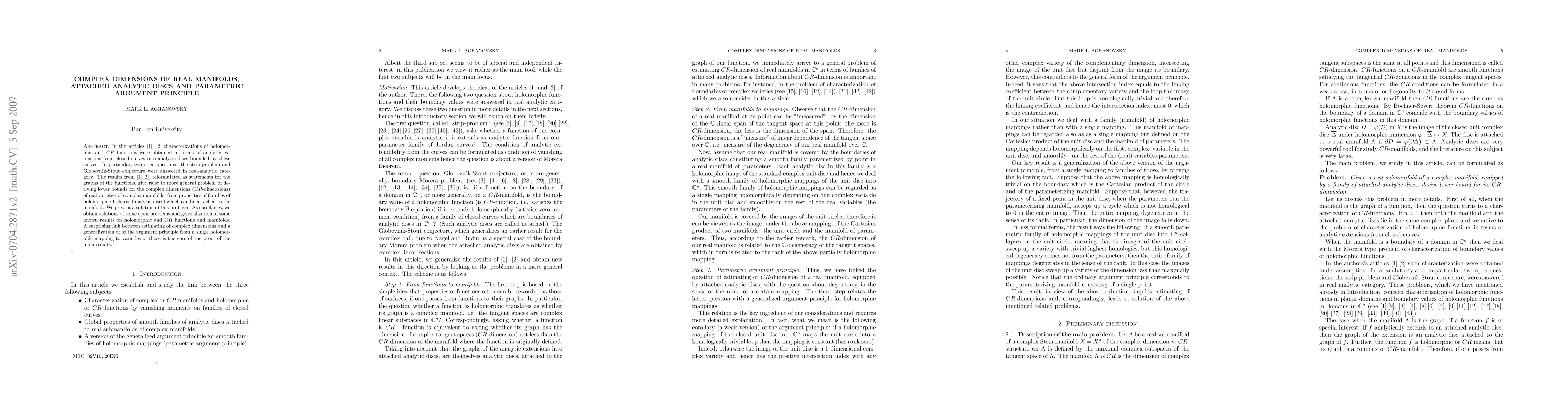 The paper investigates the relationship between topological properties of smooth families of attached analytic discs, lower bounds for dimensions of complex tangent spaces, and a generalized argument principle for holomorphic mappings. It characterizes complex manifolds and their boundaries using attached analytic discs, with special focus on graph cases leading to new insights on holomorphic and CR functions.