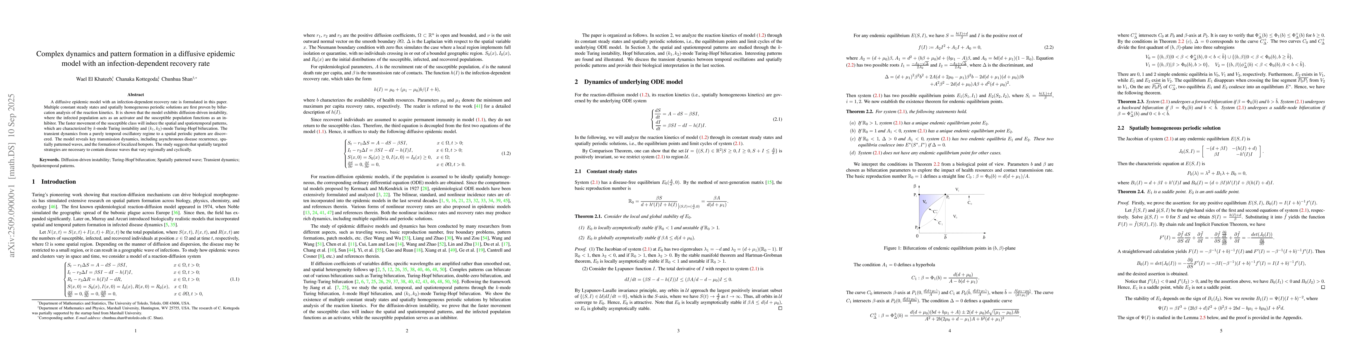 A diffusive epidemic model with an infection-dependent recovery rate is formulated in this paper. Multiple constant steady states and spatially homogeneous periodic solutions are first proven by bifur cation analysis of the reaction kinetics. It is shown that the model exhibits diffusion-driven instability, where the infected population acts as an activator and the susceptible population functions as an in hibitor. The faster movement of the susceptible class will induce the spatial and spatiotemporal patterns, which are characterized by k-mode Turing instability and (k1,k2)-mode Turing-Hopf bifurcation. The transient dynamics from a purely temporal oscillatory regime to a spatial periodic pattern are discov ered. The model reveals key transmission dynamics, including asynchronous disease recurrence, spa tially patterned waves, and the formation of localized hotspots. The study suggests that spatially targeted strategies are necessary to contain disease waves that vary regionally and cyclically.