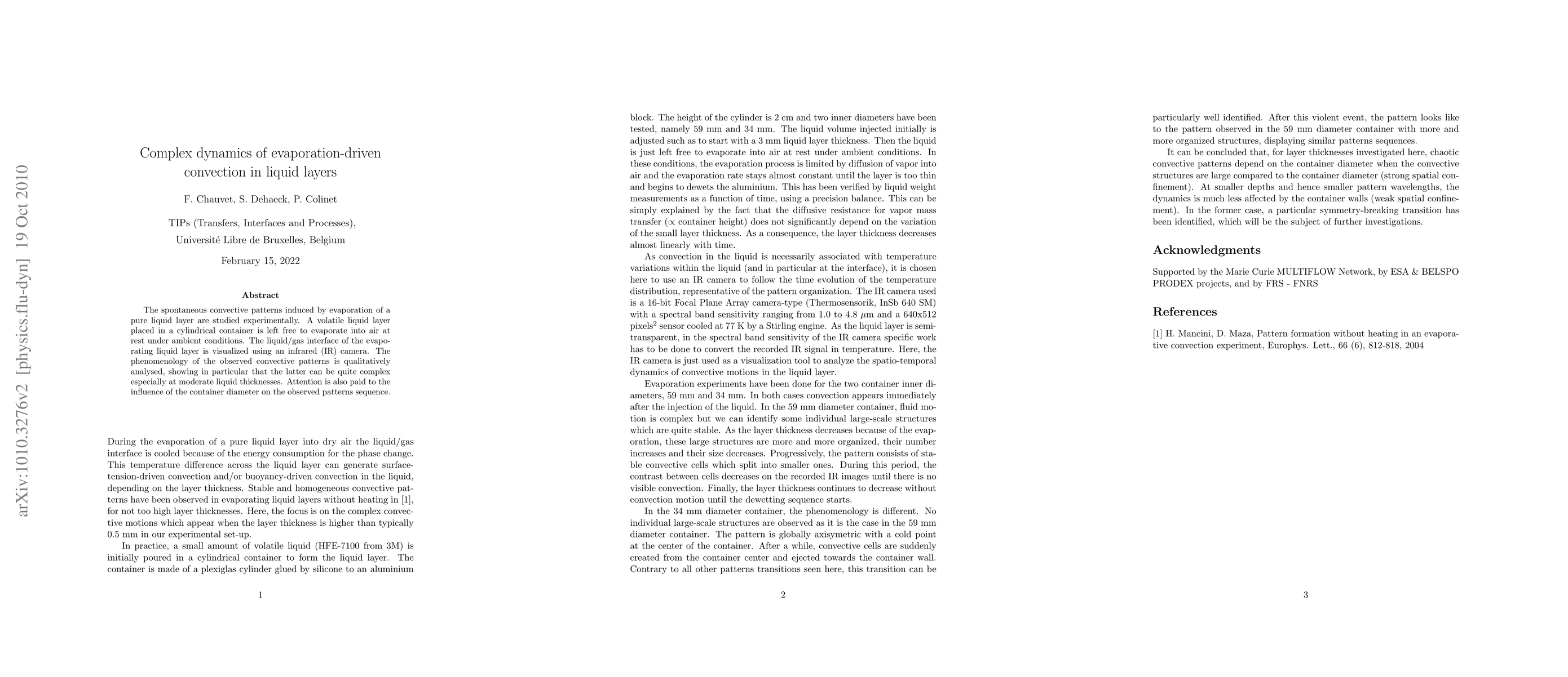 The spontaneous convective patterns induced by evaporation of a pure liquid layer are studied experimentally. A volatile liquid layer placed in a cylindrical container is left free to evaporate into air at rest under ambient conditions. The liquid/gas interface of the evaporating liquid layer is visualized using an infrared (IR) camera. The phenomenology of the observed convective patterns is qualitatively analysed, showing in particular that the latter can be quite complex especially at moderate liquid thicknesses. Attention is also paid to the influence of the container diameter on the observed patterns sequence.