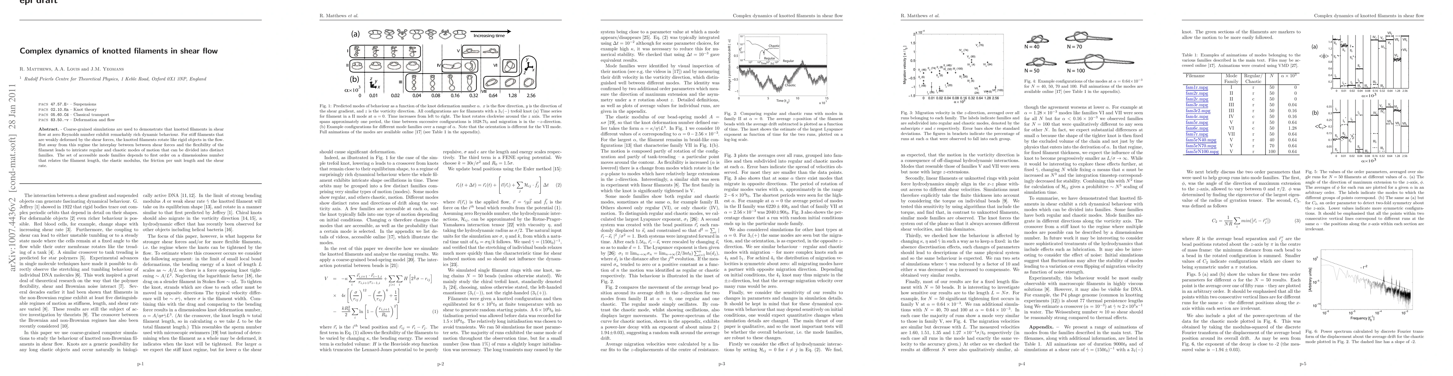 This paper explores the complex dynamics of knotted filaments under shear flow, revealing intricate regular and chaotic motion patterns influenced by filament flexibility and shear forces. The accessible motion modes are primarily determined by a dimensionless parameter linking filament length, elasticity, friction, and shear rate.