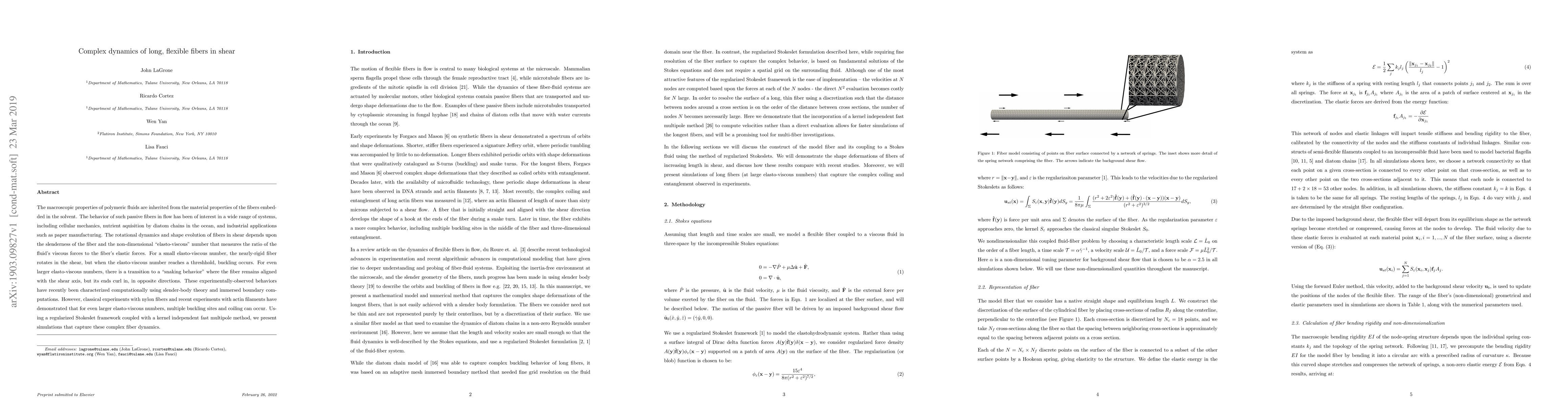 The macroscopic properties of polymeric fluids are inherited from the material properties of the fibers embedded in the solvent. The behavior of such passive fibers in flow has been of interest in a wide range of systems, including cellular mechanics, nutrient aquisition by diatom chains in the ocean, and industrial applications such as paper manufacturing. The rotational dynamics and shape evolution of fibers in shear depends upon the slenderness of the fiber and the non-dimensional "elasto-viscous" number that measures the ratio of the fluid's viscous forces to the fiber's elastic forces. For a small elasto-viscous number, the nearly-rigid fiber rotates in the shear, but when the elasto-viscous number reaches a threshhold, buckling occurs. For even larger elasto-viscous numbers, there is a transition to a "snaking behavior" where the fiber remains aligned with the shear axis, but its ends curl in, in opposite directions. These experimentally-observed behaviors have recently been characterized computationally using slender-body theory and immersed boundary computations. However, classical experiments with nylon fibers and recent experiments with actin filaments have demonstrated that for even larger elasto-viscous numbers, multiple buckling sites and coiling can occur. Using a regularized Stokeslet framework coupled with a kernel independent fast multipole method, we present simulations that capture these complex fiber dynamics.