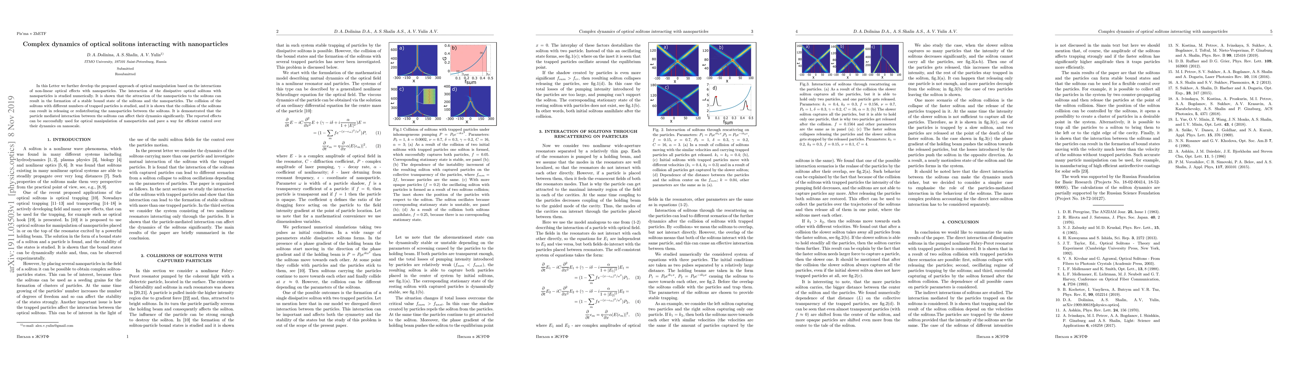 In this Letter we further develop the proposed approach of optical manipulation based on the interactions of non-linear optical effects with nanoparticles. The interaction of the dissipative optical solitons with nanoparticles is studied numerically. It is shown that the attraction of the nanoparticles to the solitons can result in the formation of a stable bound state of the solitons and the nanoparticles. The collision of the solitons with different numbers of trapped particles is studied, and it is shown that the collision of the solitons can result in releasing or redistributing the nanoparticles between the solitons. It is demonstrated that the particle mediated interaction between the solitons can affect their dynamics significantly. The reported effects can be successfully used for optical manipulation of nanoparticles and pave a way for efficient control over their dynamics on nanoscale.