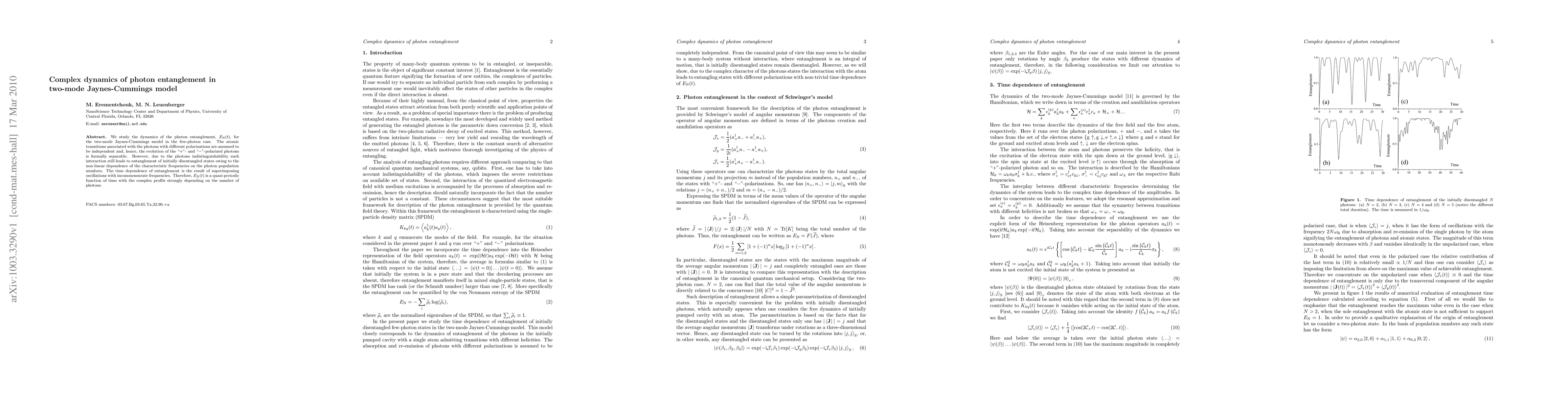 This paper investigates the dynamics of photon entanglement in the two-mode Jaynes-Cummings model, focusing on few-photon scenarios. Despite the independence of atomic transitions for different polarizations, indistinguishability of photons leads to entanglement, with the time dependence of entanglement being a quasi-periodic function due to incommensurate oscillation frequencies.
