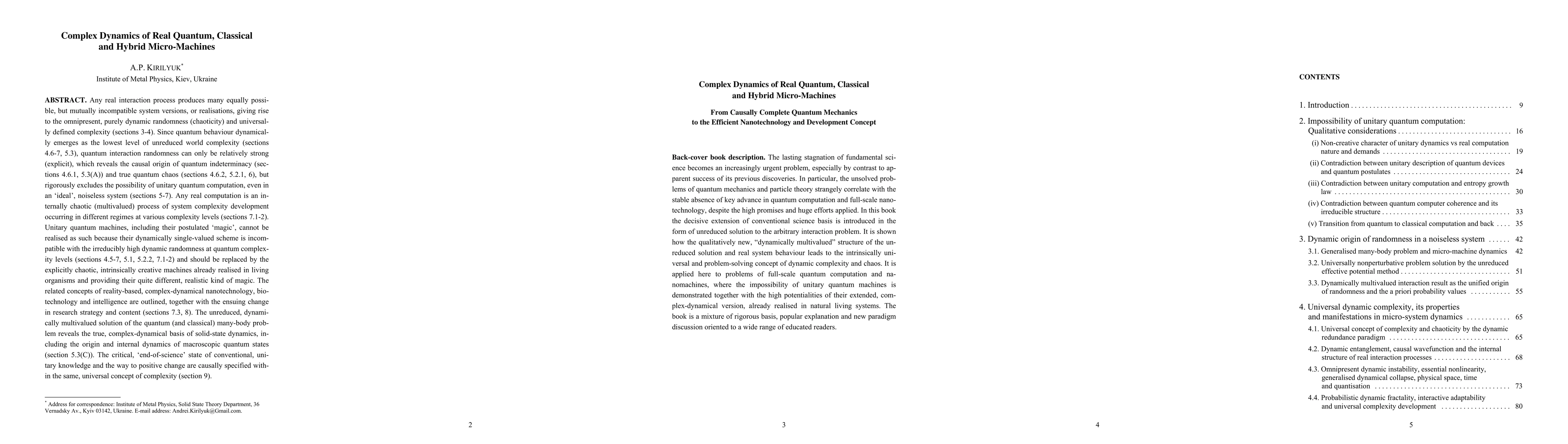 Any real interaction process produces many incompatible system versions, or realisations, giving rise to omnipresent dynamic randomness and universally defined complexity (arXiv:physics/9806002). Since quantum behaviour dynamically emerges as the lowest complexity level (arXiv:quant-ph/9902016), quantum interaction randomness can only be relatively strong, which reveals the causal origin of quantum indeterminacy (arXiv:quant-ph/9511037) and true quantum chaos (arXiv:quant-ph/9511035), but rigorously excludes the possibility of unitary quantum computation, even in an "ideal", noiseless system. Any real computation is an internally chaotic (multivalued) process of system complexity development occurring in different regimes. Unitary quantum machines, including their postulated "magic", cannot be realised as such because their dynamically single-valued scheme is incompatible with the irreducibly high dynamic randomness at quantum complexity levels and should be replaced by explicitly chaotic, intrinsically creative machines already realised in living organisms and providing their quite different, realistic kind of magic. The related concepts of reality-based, complex-dynamical nanotechnology, biotechnology and intelligence are outlined, together with the ensuing change in research strategy. The unreduced, dynamically multivalued solution to the many-body problem reveals the true, complex-dynamical basis of solid-state dynamics, including the origin and internal dynamics of macroscopic quantum states. The critical, "end-of-science" state of unitary knowledge and the way to positive change are causally specified within the same, universal concept of complexity.