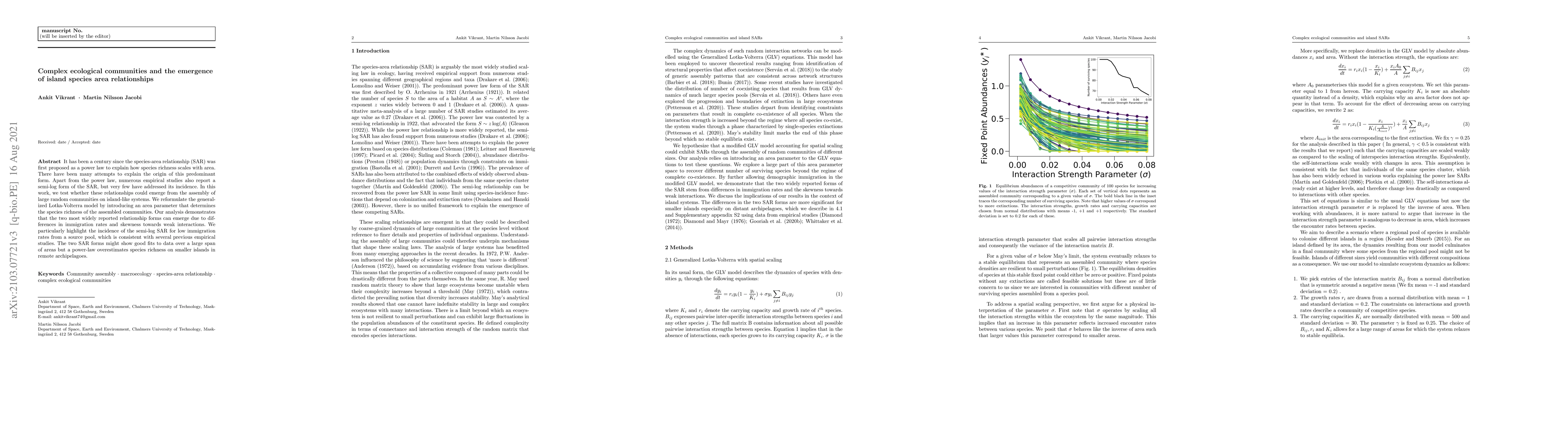 This paper explores how species-area relationships (SAR) emerge in complex ecological communities, showing that both power-law and semi-log forms can arise from random community assembly on island-like systems. It highlights that the semi-log form is more likely at low immigration rates, consistent with empirical observations.