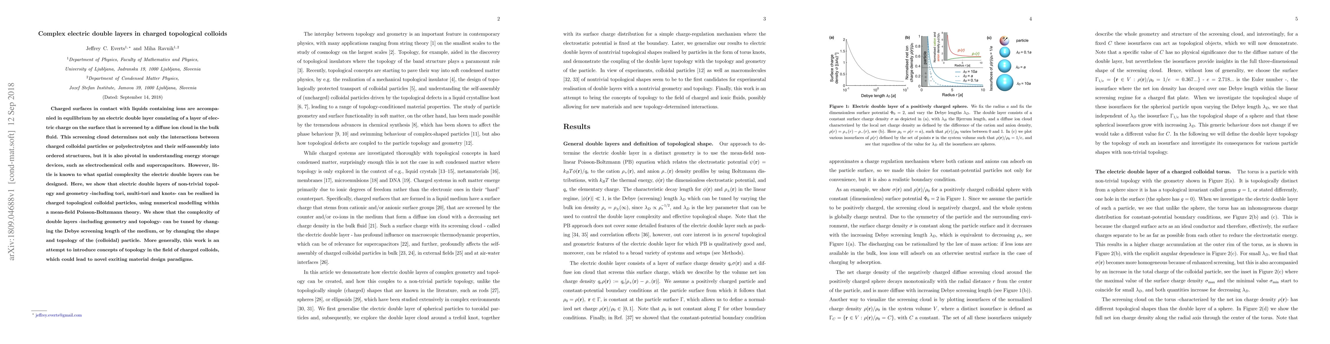 Charged surfaces in contact with liquids containing ions are accompanied in equilibrium by an electric double layer consisting of a layer of electric charge on the surface that is screened by a diffuse ion cloud in the bulk fluid. This screening cloud determines not only the interactions between charged colloidal particles or polyelectrolytes and their self-assembly into ordered structures, but it is also pivotal in understanding energy storage devices, such as electrochemical cells and supercapacitors. However, little is known to what spatial complexity the electric double layers can be designed. Here, we show that electric double layers of non-trivial topology and geometry -including tori, multi-tori and knots- can be realised in charged topological colloidal particles, using numerical modelling within a mean-field Poisson-Boltzmann theory. We show that the complexity of double layers -including geometry and topology- can be tuned by changing the Debye screening length of the medium, or by changing the shape and topology of the (colloidal) particle. More generally, this work is an attempt to introduce concepts of topology in the field of charged colloids, which could lead to novel exciting material design paradigms.