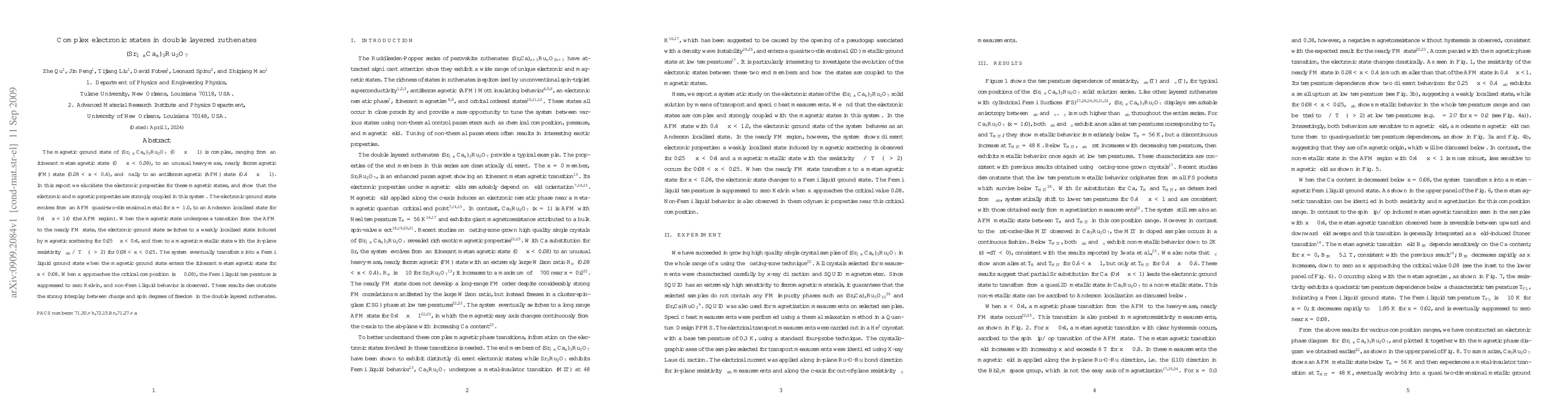 The research explores the complex magnetic ground states of (Sr$_{1-x}$Ca$_x$)$_3$Ru$_2$O$_7$ (0 $leq x leq$ 1), transitioning from metamagnetic to nearly ferromagnetic and then to antiferromagnetic states. It reveals strong coupling between electronic and magnetic properties, with the electronic ground state evolving from metallic to localized and finally to a Fermi liquid state. Near the critical composition (x $sim$ 0.08), non-Fermi liquid behavior emerges, highlighting the intricate interplay between charge and spin degrees of freedom in double layered ruthenates.