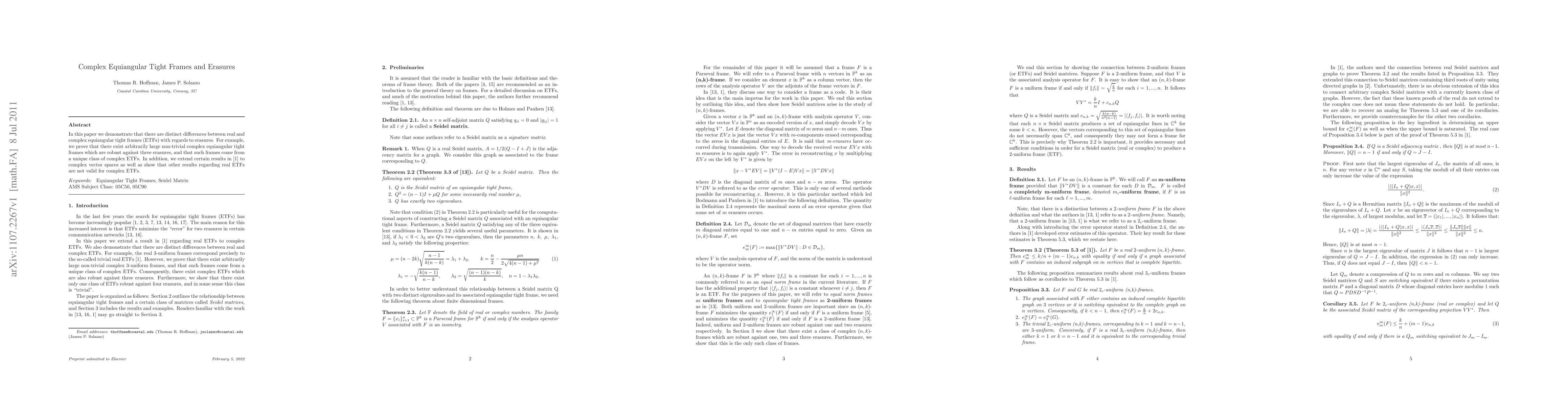 This paper highlights significant differences in how real versus complex equiangular tight frames (ETFs) behave under erasures, proving that complex ETFs can be robust against more erasures compared to their real counterparts and identifying a unique class of complex ETFs with this property. Additionally, it extends some results from real ETFs to complex spaces while refuting others.
