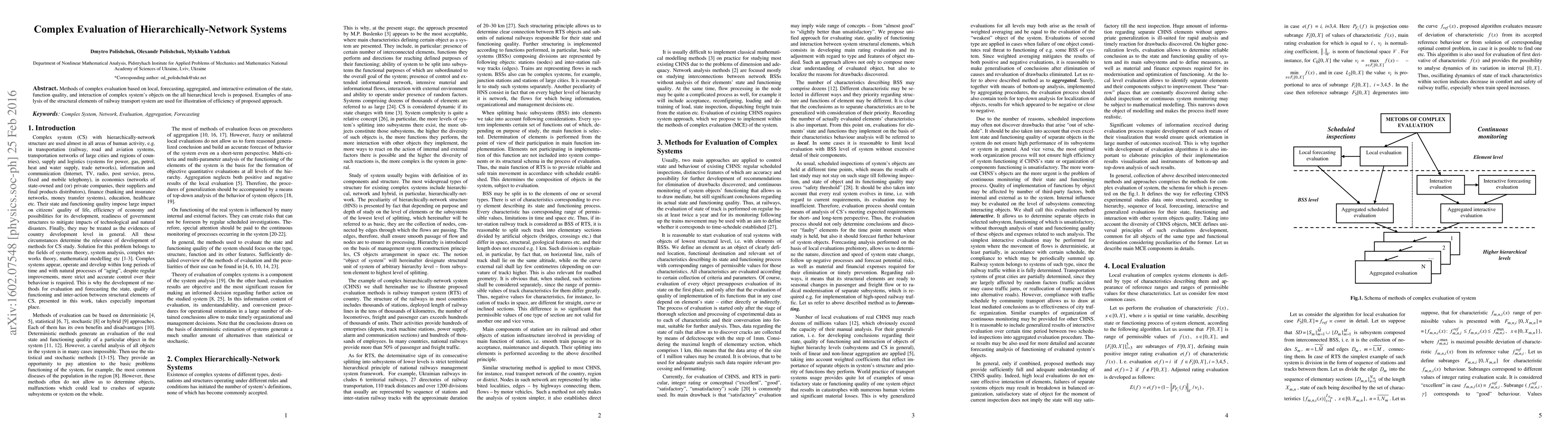 Methods of complex evaluation based on local, forecasting, aggregated, and interactive evaluation of the state, function quality, and interaction of complex system's objects on the all hierarchical levels is proposed. Examples of analysis of the structural elements of railway transport system are used for illustration of efficiency of proposed approach.