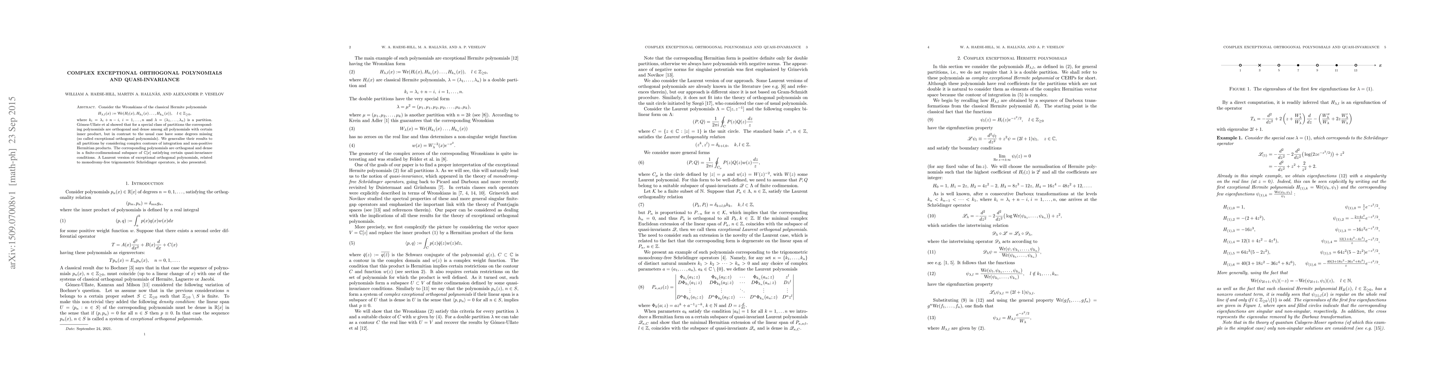 Consider the Wronskians of the classical Hermite polynomials $$H_{\lambda, l}(x):=\mathrm{Wr}(H_l(x),H_{k_1}(x),\ldots, H_{k_n}(x)), \quad l \in \mathbb Z_{\geq 0},$$ where $k_i=\lambda_i+n-i, \,\, i=1,\dots, n$ and $\lambda=(\lambda_1, \dots, \lambda_n)$ is a partition. G\'omez-Ullate et al showed that for a special class of partitions the corresponding polynomials are orthogonal and dense among all polynomials with certain inner product, but in contrast to the usual case have some degrees missing (so called exceptional orthogonal polynomials). We generalise their results to all partitions by considering complex contours of integration and non-positive Hermitian products. The corresponding polynomials are orthogonal and dense in a finite-codimensional subspace of $\mathbb C[x]$ satisfying certain quasi-invariance conditions. A Laurent version of exceptional orthogonal polynomials, related to monodromy-free trigonometric Schr\"odinger operators, is also presented.