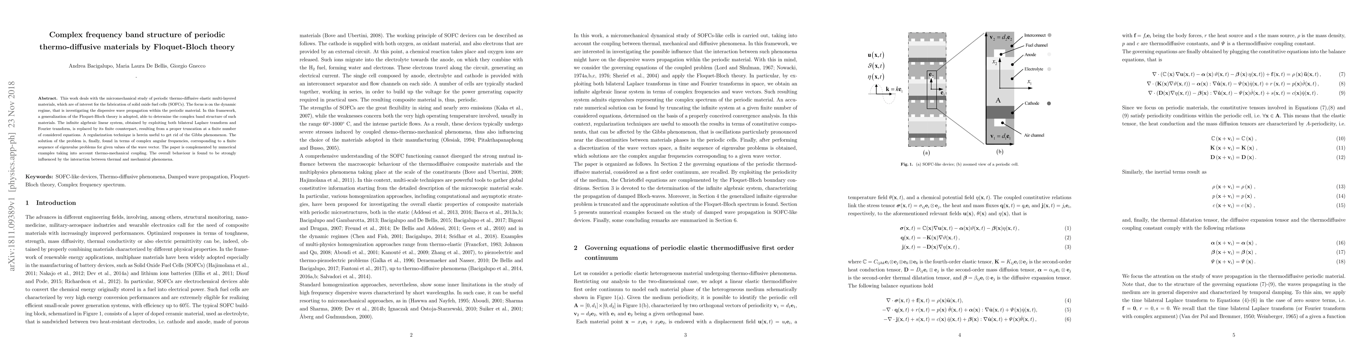This work deals with the micromechanical study of periodic thermo-diffusive elastic multi-layered materials, which are of interest for the fabrication of solid oxide fuel cells (SOFCs). The focus is on the dynamic regime, that is investigating the dispersive wave propagation within the periodic material. In this framework, a generalization of the Floquet-Bloch theory is adopted, able to determine the complex band structure of such materials. The infinite algebraic linear system, obtained by exploiting both bilateral Laplace transform and Fourier transform, is replaced by its finite counterpart, resulting from a proper truncation at a finite number of considered equations. A regularization technique is herein useful to get rid of the Gibbs phenomenon. The solution of the problem is, finally, found in terms of complex angular frequencies, corresponding to a finite sequence of eigenvalue problems for given values of the wave vector. The paper is complemented by numerical examples taking into account thermo-mechanical coupling. The overall behaviour is found to be strongly influenced by the interaction between thermal and mechanical phenomena.