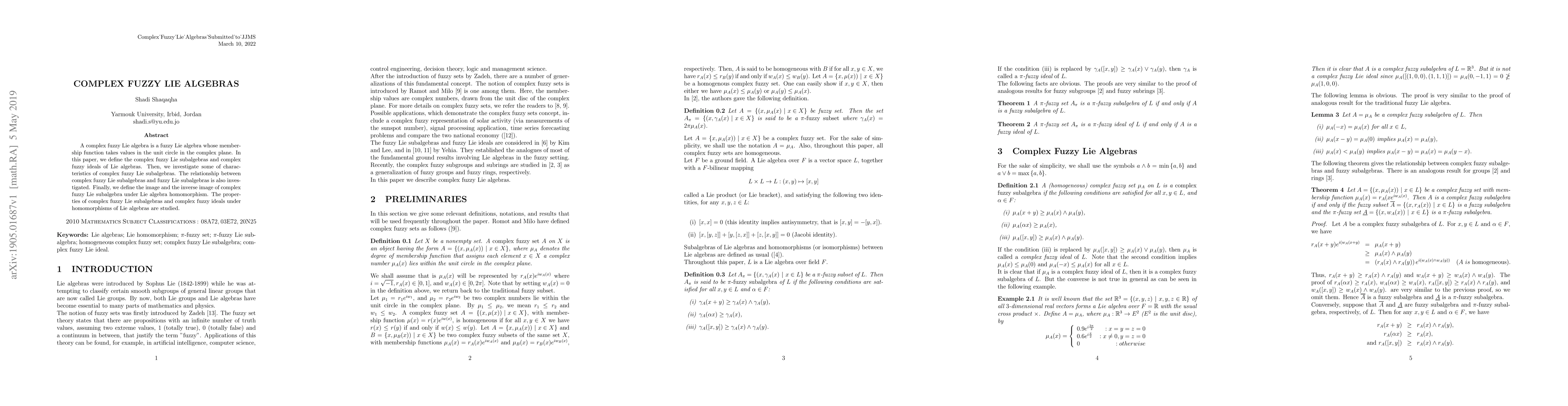 A complex fuzzy Lie algebra is a fuzzy Lie algebra whose membership function takes values in the unit circle in the complex plane. In this paper, we deine the complex fuzzy Lie subalgebras and complex fuzzy ideals of Lie algebras. Then, we investigate some of characteristics of complex fuzzy Lie subalgebras. The relationship between complex fuzzy Lie subalgebras and fuzzy Lie subalgebras is also investigated. Finally, we define the image and the inverse image of complex fuzzy Lie subalgebra under Lie algebra homomorphism. The properties of complex fuzzy Lie subalgebras and complex fuzzy ideals under homomorphisms of Lie algebras are studied.
