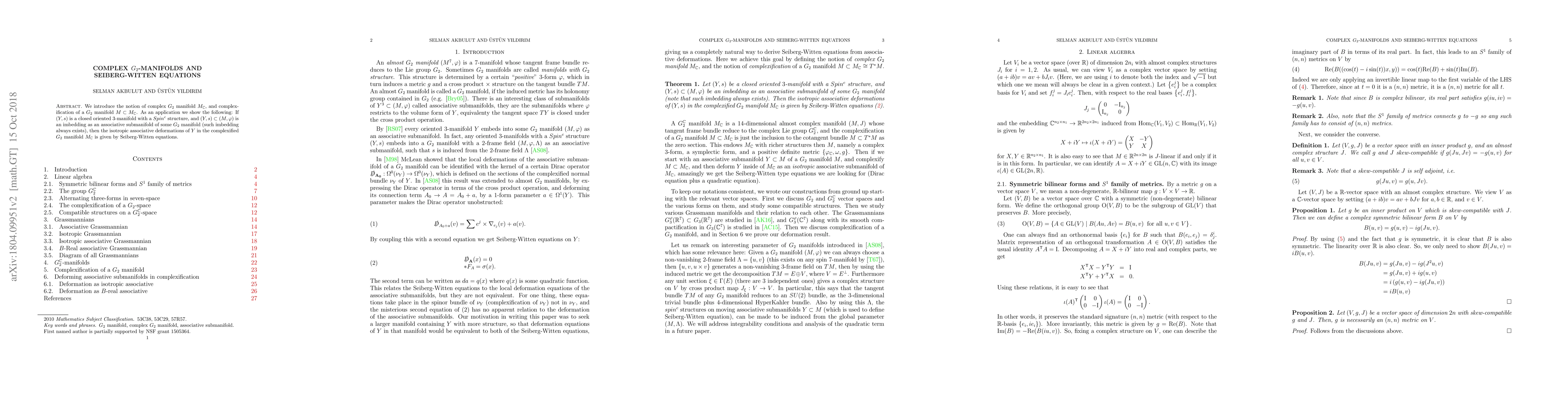 We introduce the notion of complex $G_2$ manifold $M_{\mathbb C}$, and complexification of a $G_2$ manifold $M\subset M_{\mathbb C}$. As an application we show the following: If $(Y,s)$ is a closed oriented $3$-manifold with a $Spin^{c}$ structure, and $(Y,s)\subset (M, \varphi)$ is an imbedding as an associative submanifold of some $G_2$ manifold (such imbedding always exists), then the isotropic associative deformations of $Y$ in the complexified $G_2$ manifold $M_{\mathbb C}$ is given by Seiberg-Witten equations.