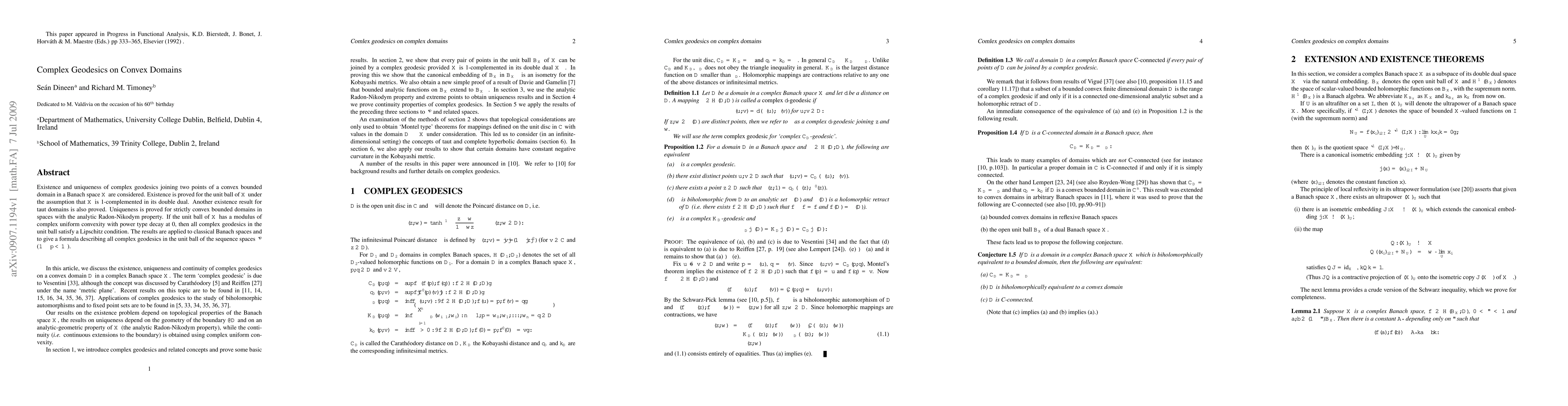This paper proves the existence and uniqueness of complex geodesics in convex bounded domains within Banach spaces, with specific results for the unit ball under certain conditions. It also provides a formula for all complex geodesics in the unit ball of sequence spaces $\ell^p$.