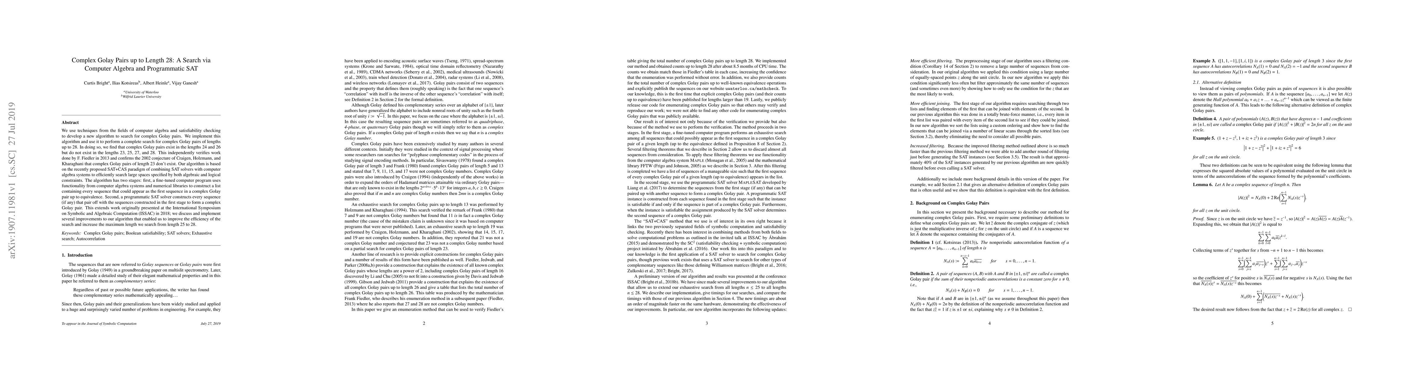 This paper presents a new algorithm combining computer algebra and SAT solving to search for complex Golay pairs up to length 28. The algorithm confirms the existence of pairs at lengths 24 and 26, and verifies the non-existence of pairs at lengths 23, 25, 27, and 28, supporting previous conjectures.