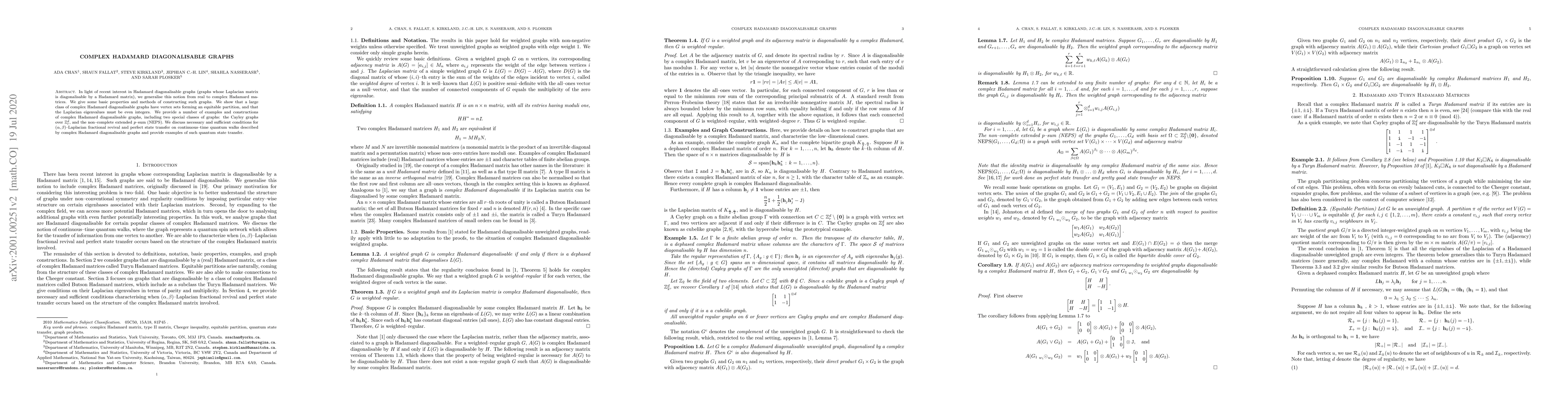 In light of recent interest in Hadamard diagonalisable graphs (graphs whose Laplacian matrix is diagonalisable by a Hadamard matrix), we generalise this notion from real to complex Hadamard matrices. We give some basic properties and methods of constructing such graphs. We show that a large class of complex Hadamard diagonalisable graphs have vertex sets forming an equitable partition, and that the Laplacian eigenvalues must be even integers. We provide a number of examples and constructions of complex Hadamard diagonalisable graphs, including two special classes of graphs: the Cayley graphs over $\mathbb{Z}_r^d$, and the non--complete extended $p$--sum (NEPS). We discuss necessary and sufficient conditions for $(\alpha, \beta)$--Laplacian fractional revival and perfect state transfer on continuous--time quantum walks described by complex Hadamard diagonalisable graphs and provide examples of such quantum state transfer.