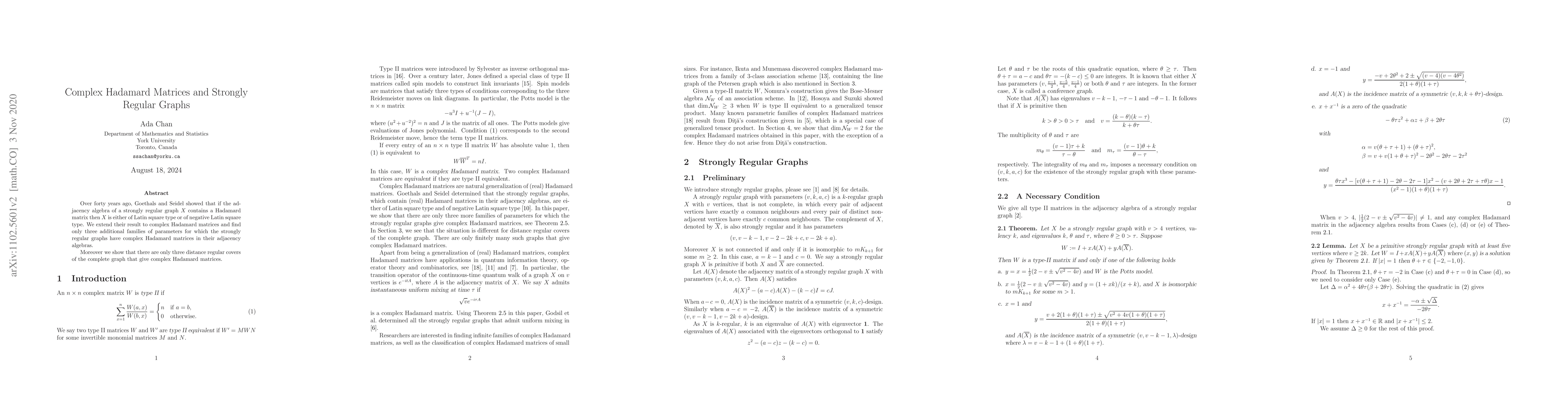 This paper extends the result by Goethals and Seidel to complex Hadamard matrices, identifying only three additional families of parameters for which strongly regular graphs contain such matrices in their adjacency algebras. It also reveals that only three distance regular covers of the complete graph yield complex Hadamard matrices.