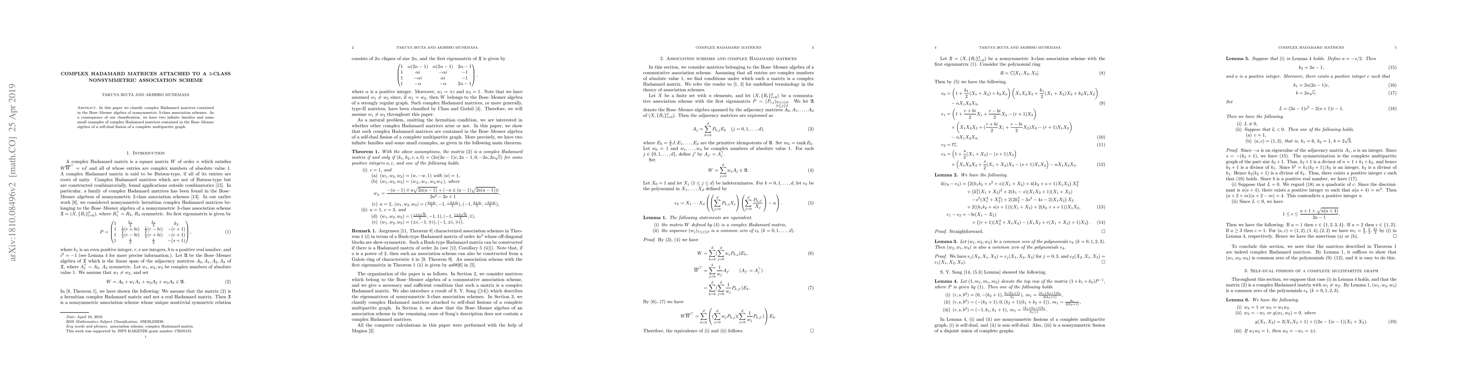 This paper classifies complex Hadamard matrices within the Bose-Mesner algebra of nonsymmetric 3-class association schemes, identifying two infinite families and several small examples from self-dual fissions of complete multipartite graphs.