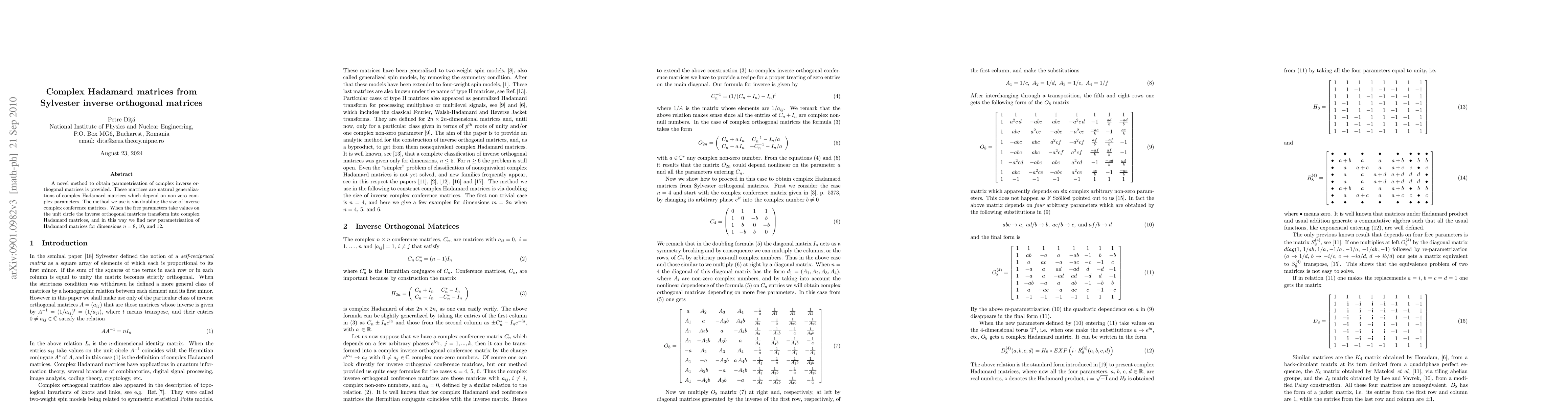 This paper introduces a novel method to parametrize complex inverse orthogonal matrices, generalizing complex Hadamard matrices using non-zero complex parameters. By doubling the size of inverse complex conference matrices and adjusting parameters on the unit circle, the authors derive new parametrizations for Hadamard matrices in dimensions n=8, 10, 12.