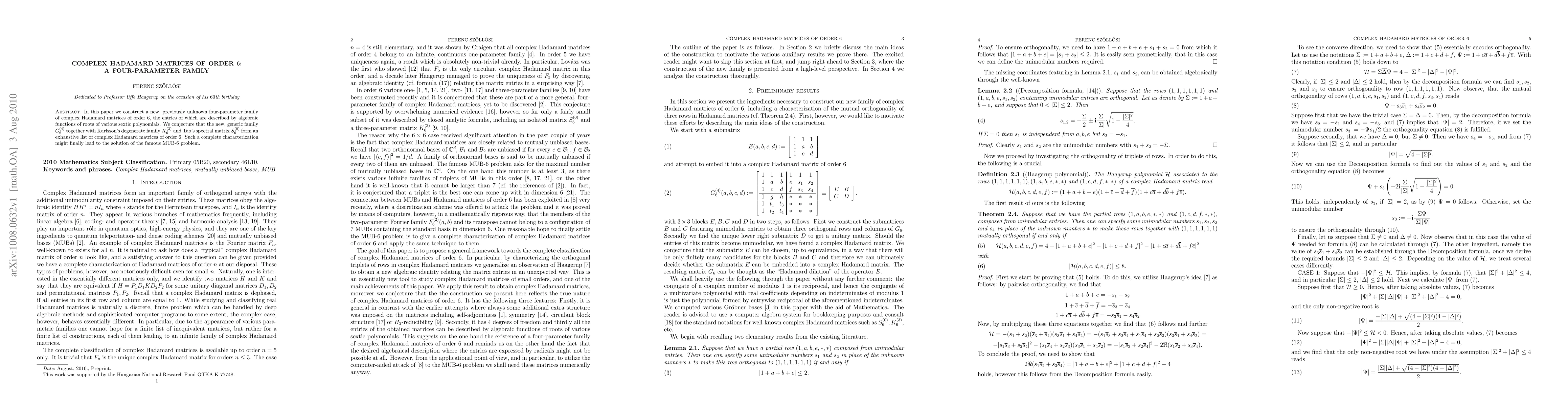 The paper introduces a novel algebraic construction method for complex Hadamard matrices of order 6, providing a four-parameter family described by roots of sextic polynomials.