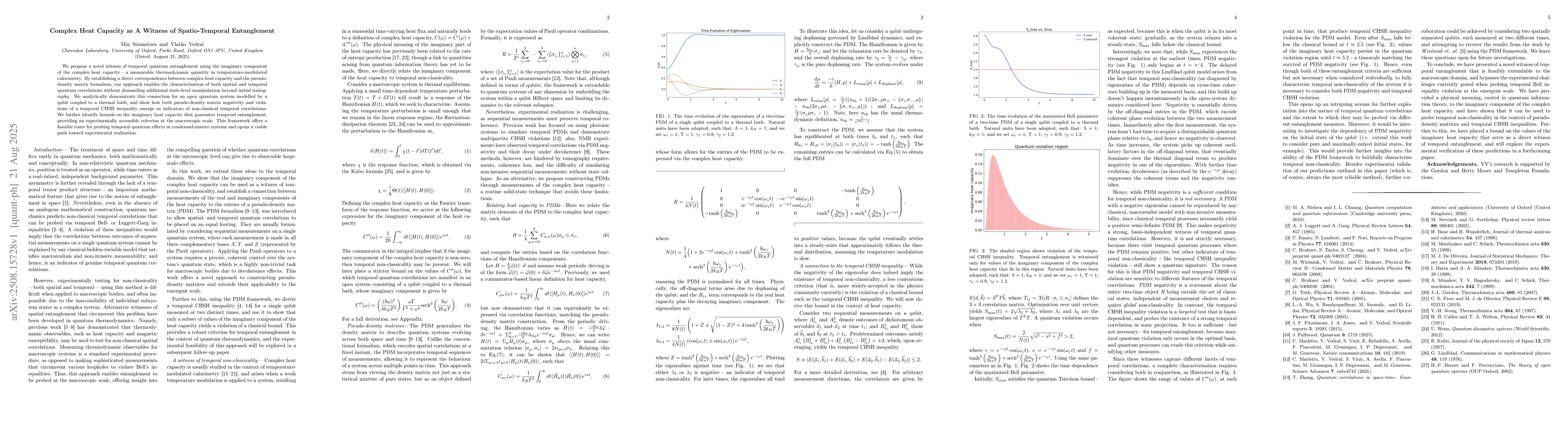 We propose a novel witness of temporal quantum entanglement using the imaginary component of the complex heat capacity - a measurable thermodynamic quantity in temperature-modulated calorimetry. By establishing a direct correspondence between complex heat capacity and the pseudo-density matrix formalism, our approach enables the characterisation of both spatial and temporal quantum correlations without demanding additional state-level manipulation beyond initial tomography. We analytically demonstrate this connection for an open quantum system modelled by a qubit coupled to a thermal bath, and show how both pseudo-density matrix negativity and violations of a temporal CHSH inequality emerge as indicators of non-classical temporal correlations. We further identify bounds on the imaginary heat capacity that guarantee temporal entanglement, providing an experimentally accessible criterion at the macroscopic scale. This framework offers a feasible route for probing temporal quantum effects in condensed-matter systems and opens a viable path toward experimental realisation.