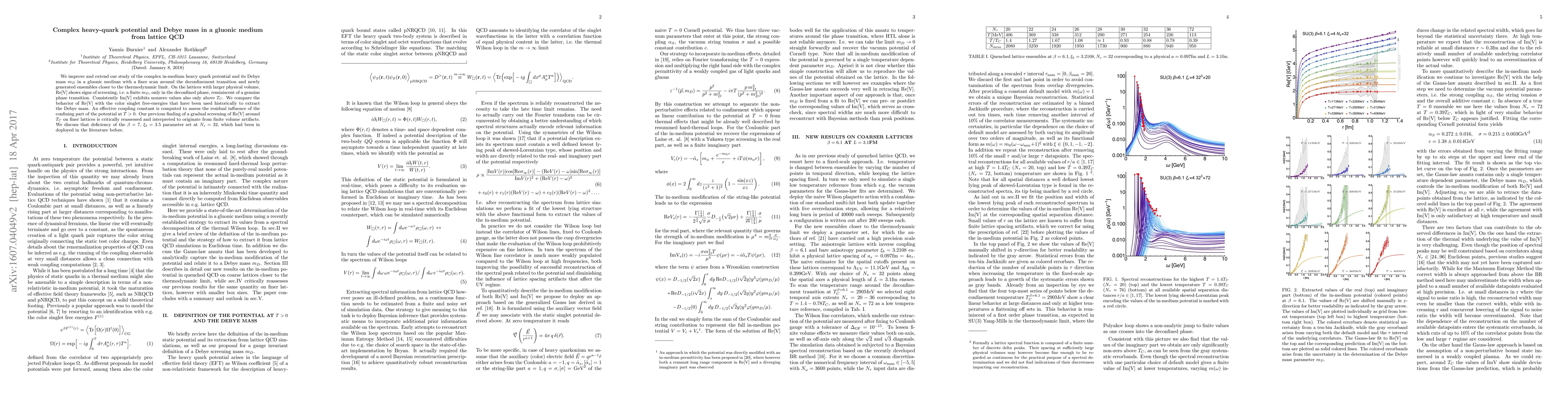 This study refines the analysis of the complex heavy-quark potential and Debye mass in a gluonic medium using lattice QCD, revealing that Re[V] shows signs of screening only in the deconfined phase, indicating a phase transition. The findings suggest that previous observations of gradual screening were due to finite volume artifacts.