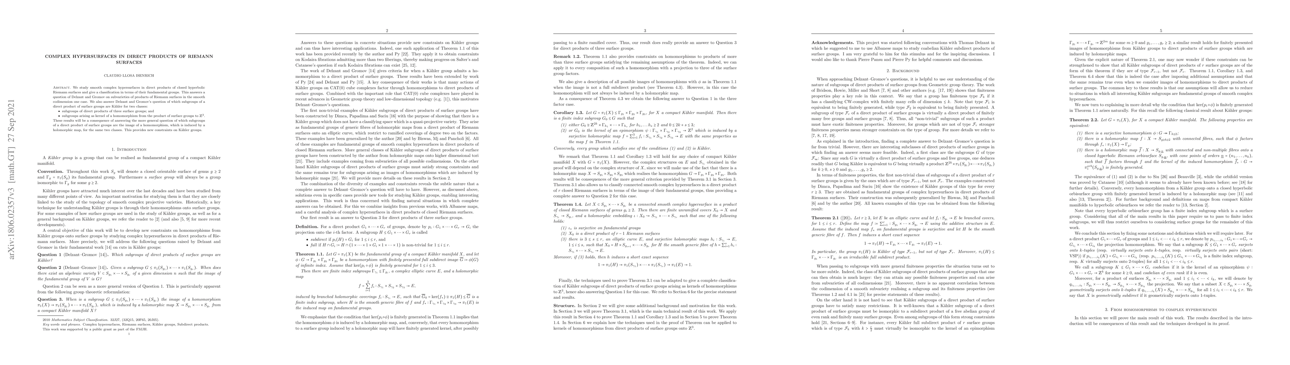 Researchers classify smooth complex hypersurfaces in direct products of closed hyperbolic Riemann surfaces based on their fundamental groups, providing new constraints on K"ahler groups.
