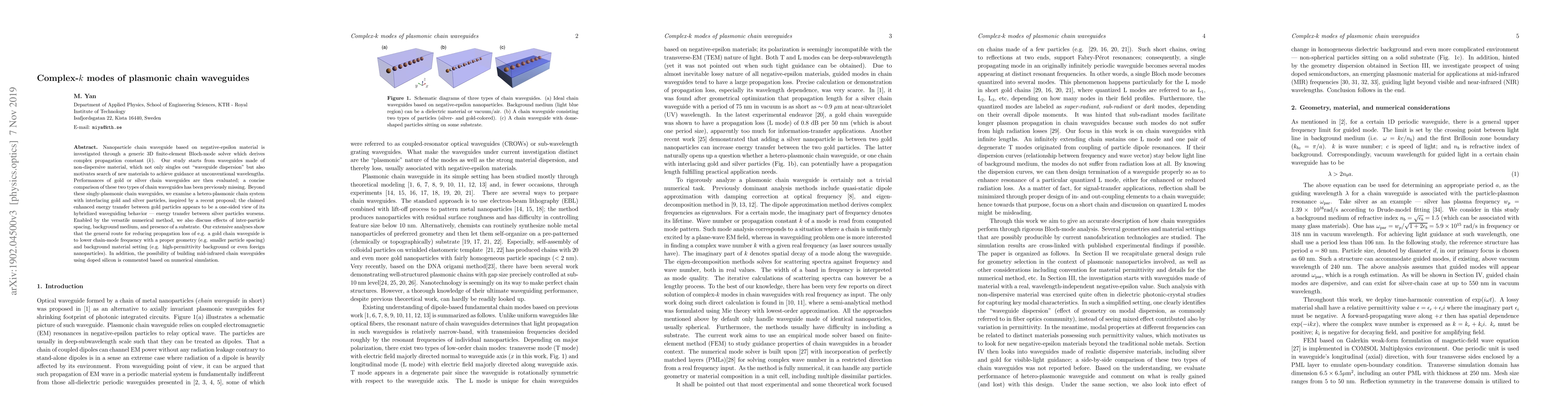 This paper investigates the complex-k modes of plasmonic chain waveguides using a 3D finite-element Bloch-mode solver, comparing gold and silver waveguides and exploring hetero-plasmonic systems. It finds that reducing chain-mode frequency through geometry and material choice can lower propagation loss, and suggests doped silicon for mid-infrared waveguides.