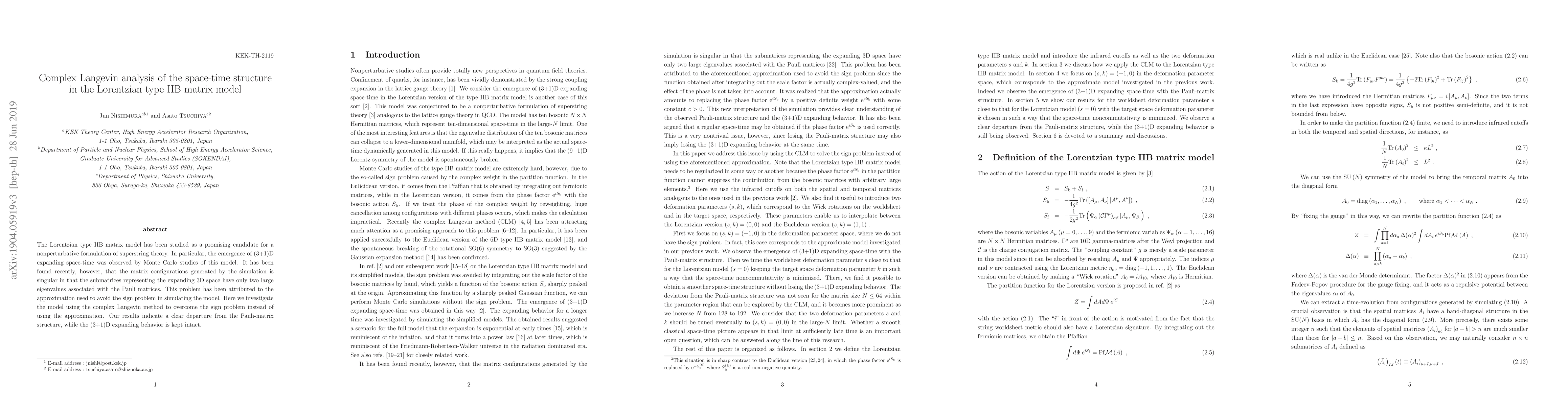 This paper employs the complex Langevin method to study the Lorentzian type IIB matrix model, aiming to address the sign problem without approximations. The results show a departure from the Pauli-matrix structure while maintaining the observed (3+1)D expanding space-time behavior.