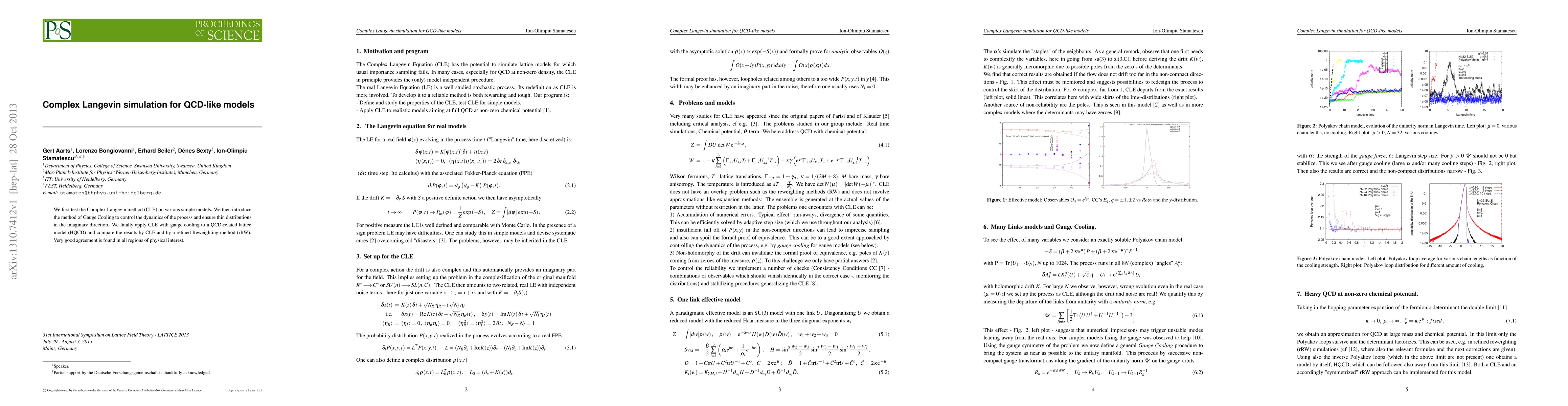 We first test the Complex Langevin method (CLE) on various simple models. We then introduce the method of Gauge Cooling to control the dynamics of the process and ensure thin distributions in the imaginary direction. We finally apply CLE with gauge cooling to a QCD-related lattice model (HQCD) and compare the results by CLE and by a refined Reweighting method (rRW). Very good agreement is found in all regions of physical interest.