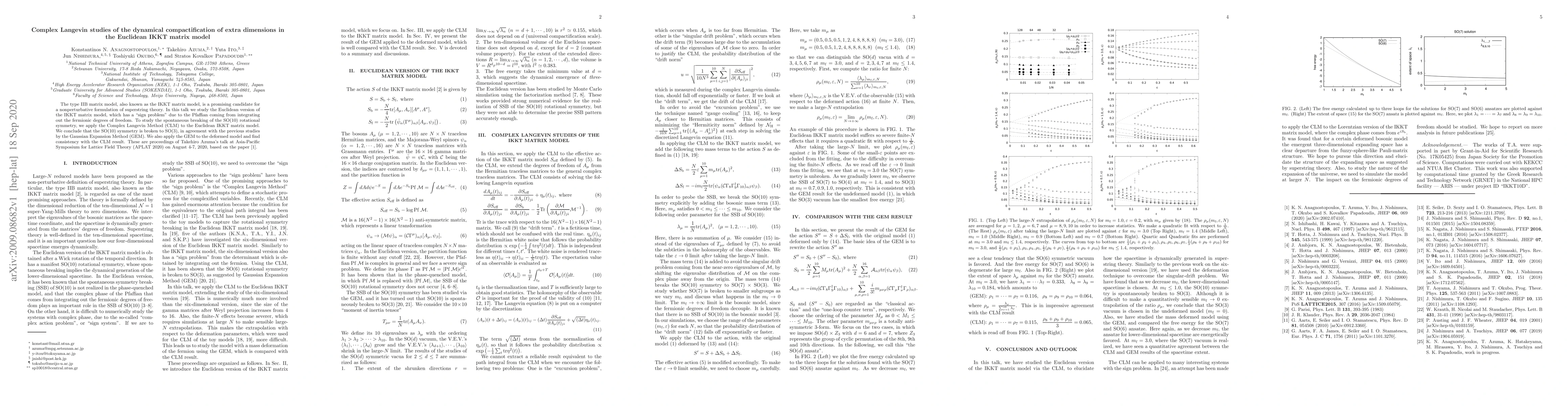 This paper applies the Complex Langevin Method to study the Euclidean IKKT matrix model, revealing the dynamical compactification of extra dimensions and the spontaneous breaking of SO(10) symmetry to SO(3), consistent with previous Gaussian Expansion Method results. The findings are presented in the proceedings of Takehiro Azuma's talk at APLAT 2020.