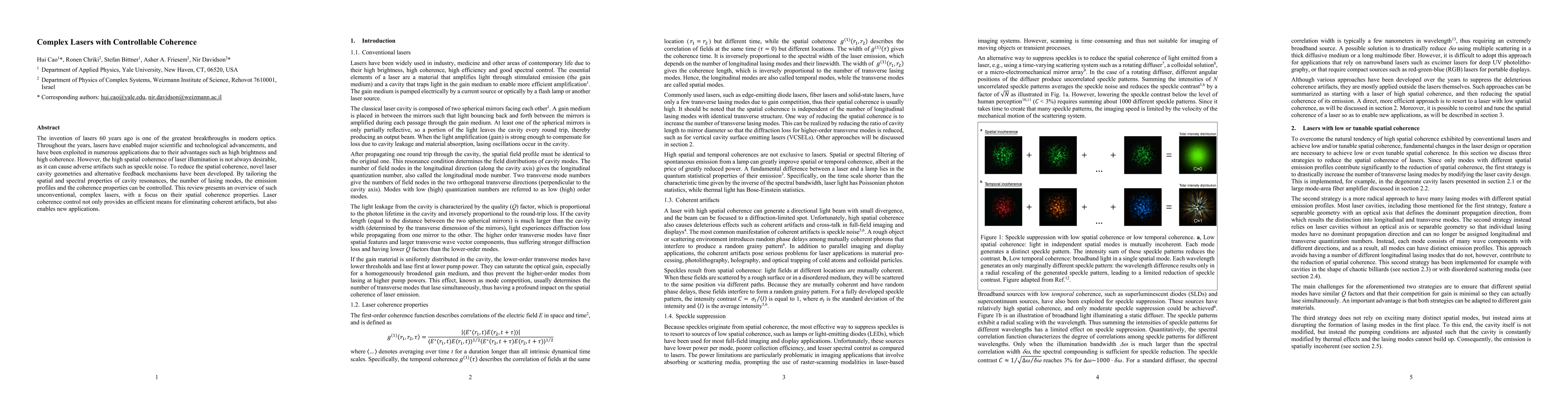 This paper reviews complex lasers with tunable coherence properties, highlighting how novel cavity designs and feedback mechanisms can control spatial and spectral characteristics to mitigate speckle noise and enable new applications. The focus is on the advantages of reduced spatial coherence over traditional high coherence lasers.