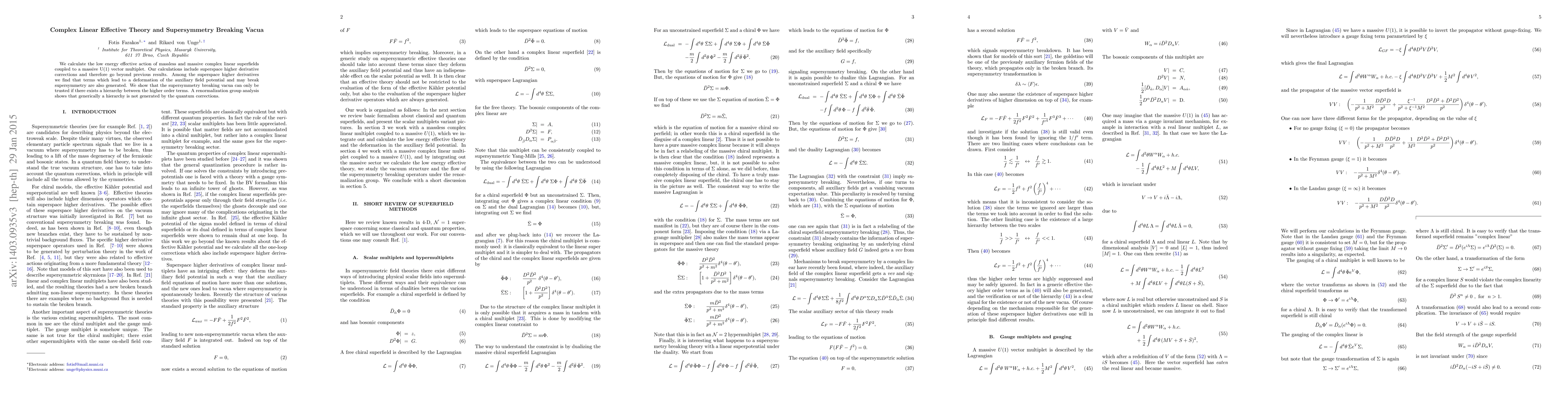 We calculate the low energy effective action of massless and massive complex linear superfields coupled to a massive U(1) vector multiplet. Our calculations include superspace higher derivative corrections and therefore go beyond previous results. Among the superspace higher derivatives we find that terms which lead to a deformation of the auxiliary field potential and may break supersymmetry are also generated. We show that the supersymmetry breaking vacua can only be trusted if there exists a hierarchy between the higher order terms. A renormalization group analysis shows that generically a hierarchy is not generated by the quantum corrections.