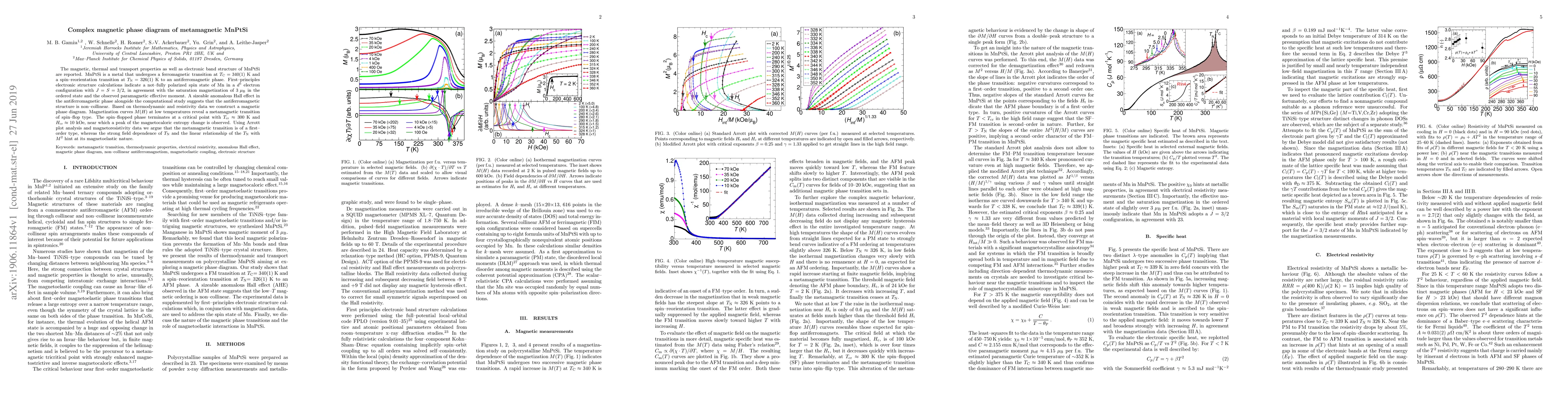 The paper describes a metal called MnPtSi that exhibits complex magnetic behavior, including a ferromagnetic transition and an antiferromagnetic phase with non-collinear structure, leading to a metamagnetic transition of spin-flop type.