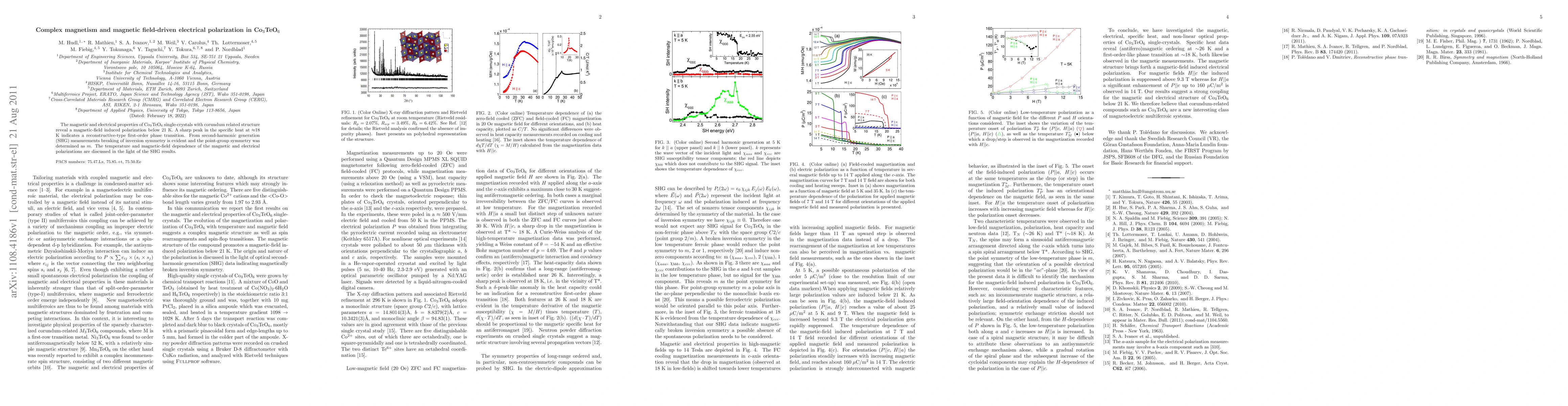 The research on Co$_3$TeO$_6$ single-crystals reveals a magnetic-field induced electrical polarization below 21 K, accompanied by a first-order phase transition at approximately 18 K. Symmetry breaking and inversion are confirmed through specific heat and second-harmonic generation measurements, with the point-group symmetry identified as m.
