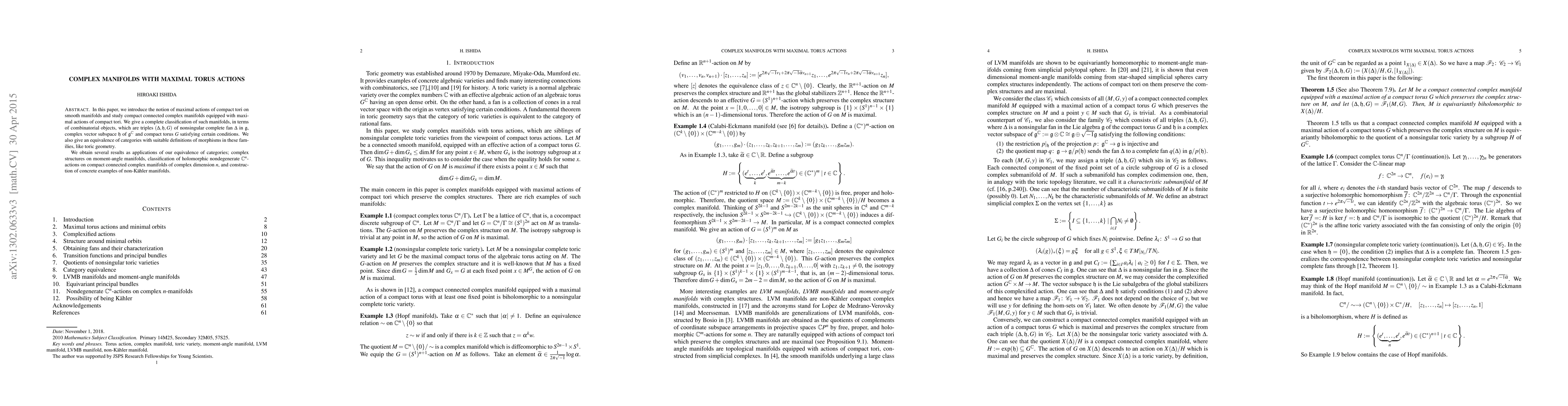 This paper classifies complex manifolds with maximal torus actions using combinatorial triples, establishing an equivalence with toric geometry and applying this to classify holomorphic actions and construct non-Kähler examples.