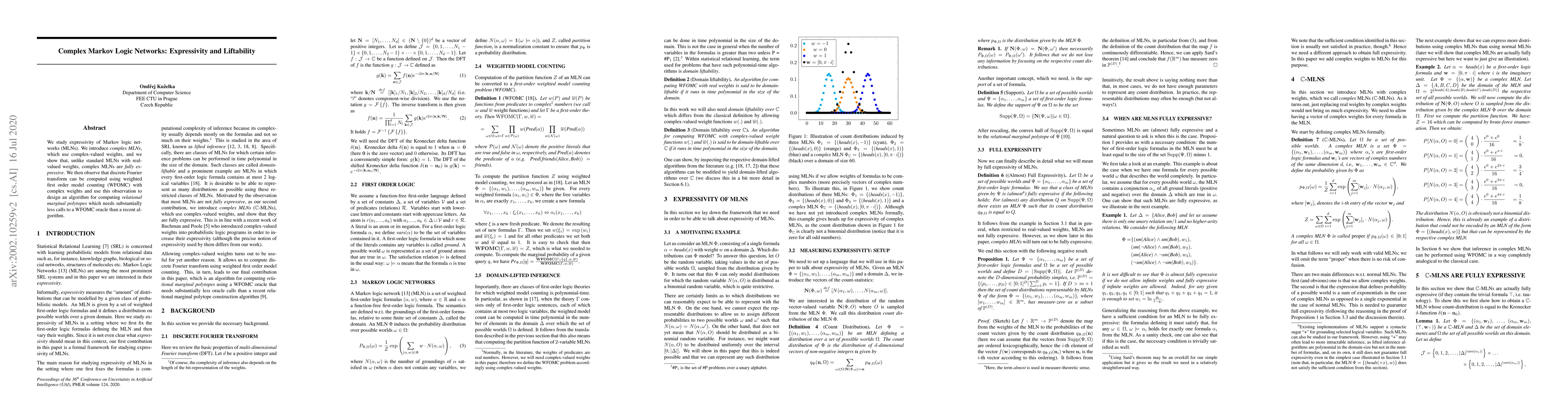 We study expressivity of Markov logic networks (MLNs). We introduce complex MLNs, which use complex-valued weights, and we show that, unlike standard MLNs with real-valued weights, complex MLNs are fully expressive. We then observe that discrete Fourier transform can be computed using weighted first order model counting (WFOMC) with complex weights and use this observation to design an algorithm for computing relational marginal polytopes which needs substantially less calls to a WFOMC oracle than a recent algorithm.