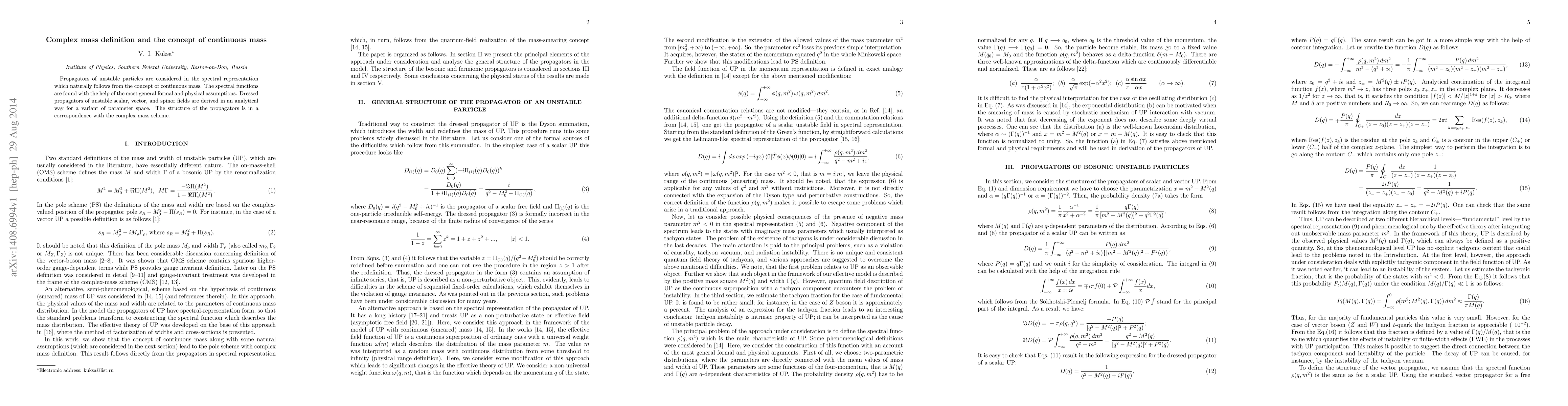 This paper derives dressed propagators for unstable scalar, vector, and spinor fields using the concept of continuous mass, leading to a structure corresponding to the complex mass scheme, all within a specified parameter space.