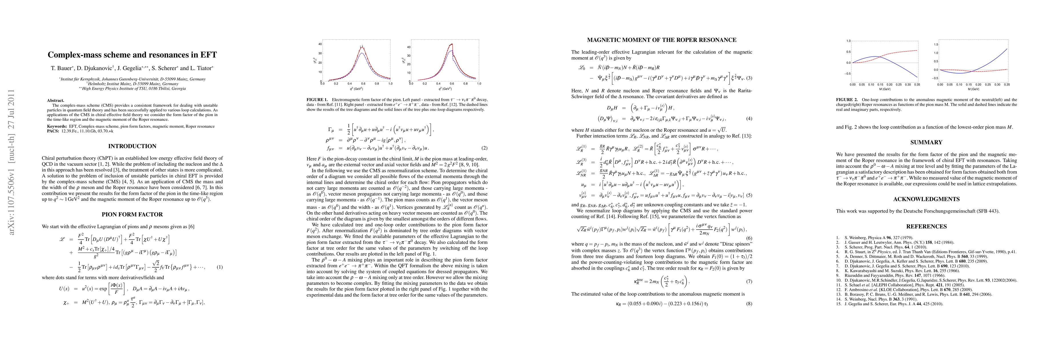 The complex-mass scheme (CMS) offers a consistent framework for handling unstable particles in quantum field theory, and this study applies CMS to calculate the pion form factor in the time-like region and the magnetic moment of the Roper resonance within chiral effective field theory.