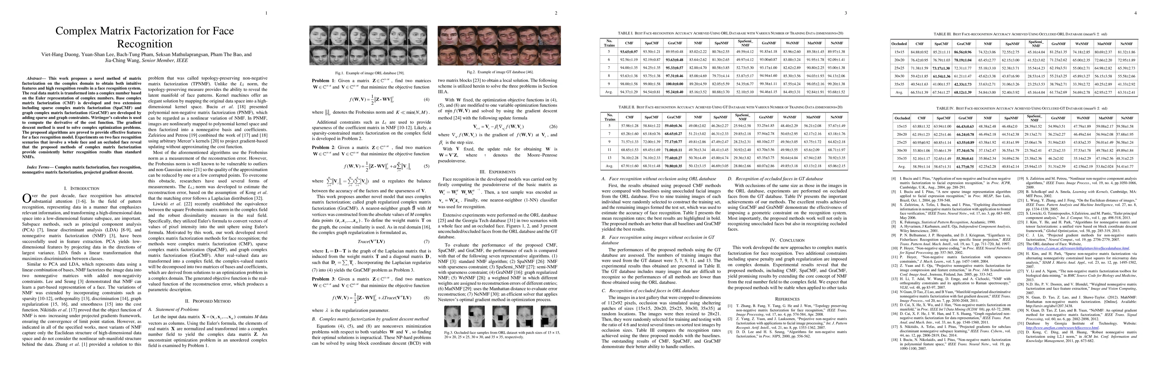This work developed novel complex matrix factorization methods for face recognition; the methods were complex matrix factorization (CMF), sparse complex matrix factorization (SpaCMF), and graph complex matrix factorization (GraCMF). After real-valued data are transformed into a complex field, the complex-valued matrix will be decomposed into two matrices of bases and coefficients, which are derived from solutions to an optimization problem in a complex domain. The generated objective function is the real-valued function of the reconstruction error, which produces a parametric description. Factorizing the matrix of complex entries directly transformed the constrained optimization problem into an unconstrained optimization problem. Additionally, a complex vector space with N dimensions can be regarded as a 2N-dimensional real vector space. Accordingly, all real analytic properties can be exploited in the complex field. The ability to exploit these important characteristics motivated the development herein of a simpler framework that can provide better recognition results. The effectiveness of this framework will be clearly elucidated in later sections in this paper.